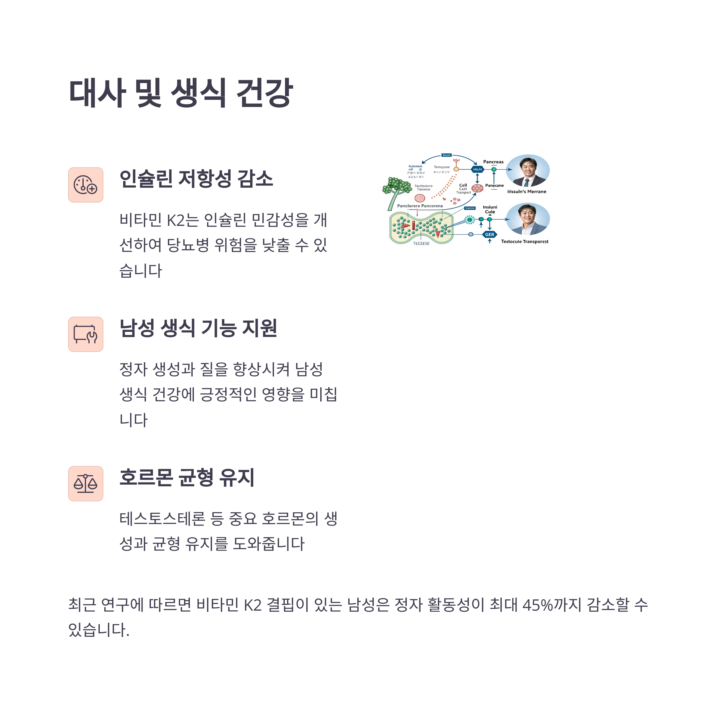 비타민 K2는 남성의 정자 생성과 생식 건강에도 중요한 역할을 합니다. 부족할 경우 정자 활동성이 감소하여 생식력이 저하될 위험이 있습니다. 특히 남성 불임 문제를 예방하기 위해 비타민 K2를 충분히 섭취하는 것이 중요합니다. 달걀노른자, 치즈, 낫토 등 비타민 K2가 풍부한 식품을 섭취하여 남성 건강을 관리하세요.