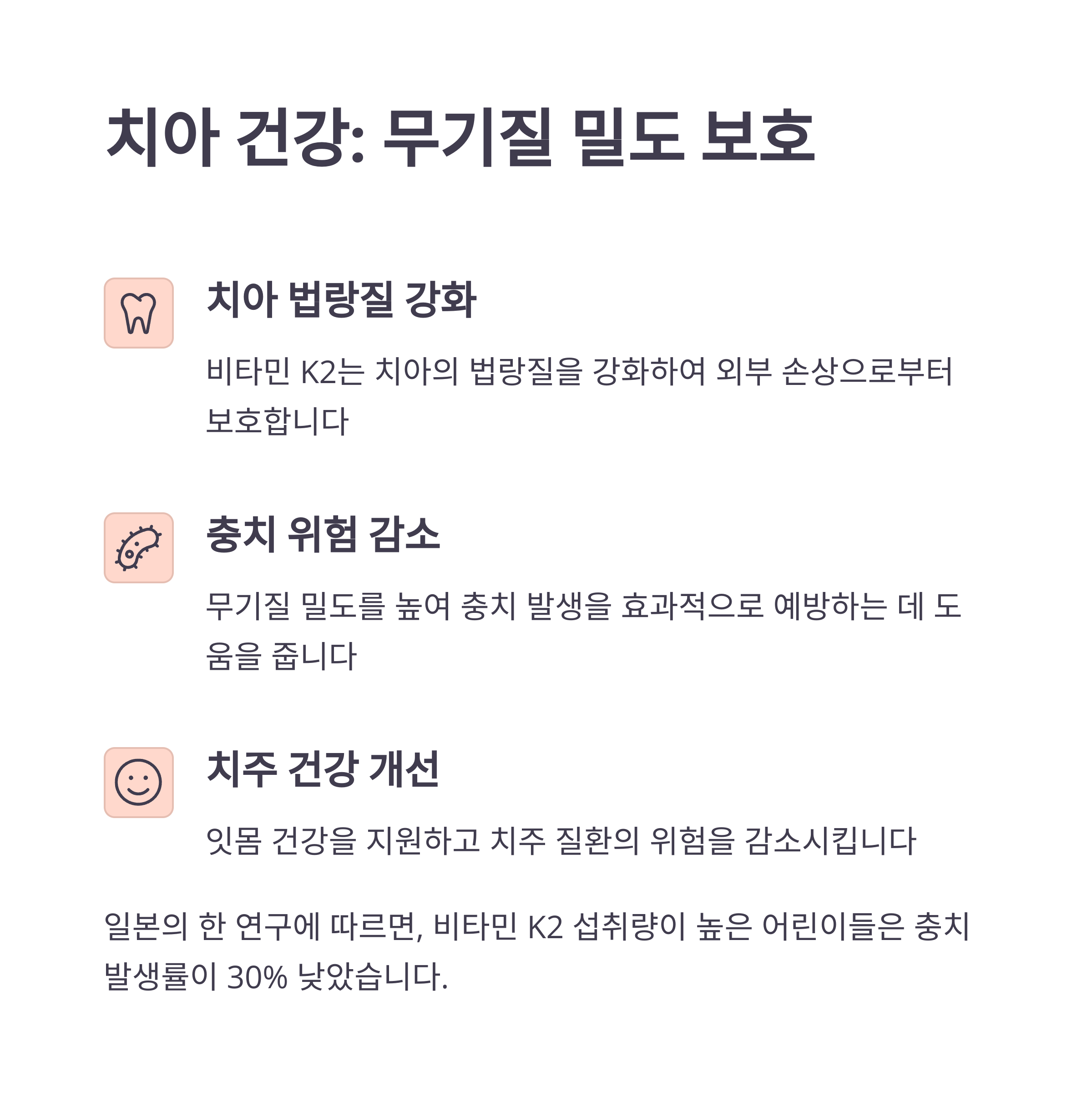 비타민 K2는 치아의 무기질 밀도를 높여주는 역할을 합니다. 부족할 경우 치아가 약해지고 충치와 같은 치아 질환이 발생할 가능성이 커집니다. 특히 성장기 아이들과 노년층에게 비타민 K2 부족은 치아 손상을 유발할 수 있어 주의가 필요합니다. 정기적인 치과 검진과 함께 비타민 K2를 충분히 섭취하여 치아 건강을 관리하세요.