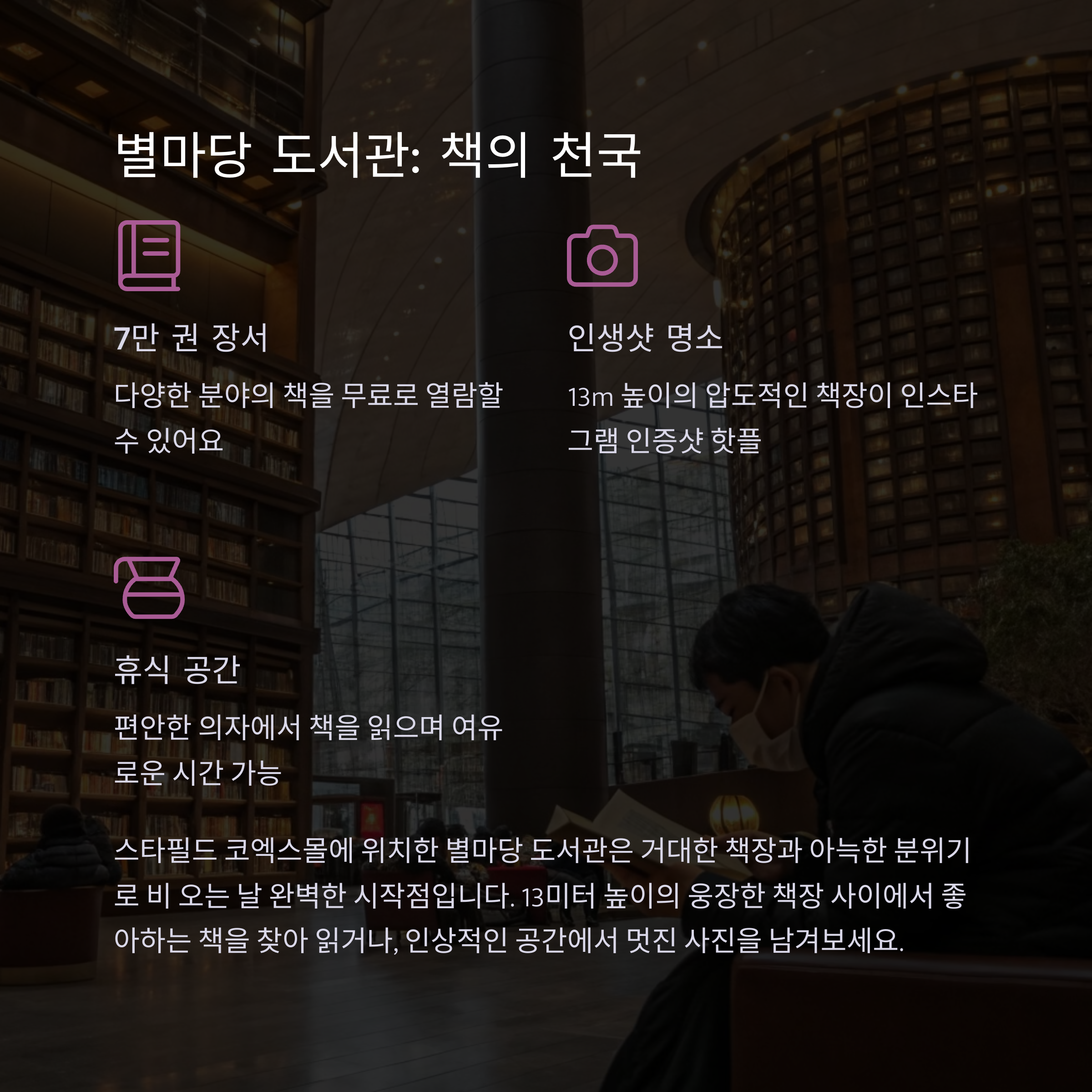 비 오는 날 코엑스에서 가장 먼저 방문할 곳은 바로 별마당 도서관입니다. 스타필드 코엑스몰 중심부에 위치한 이 도서관은 13미터 높이의 웅장한 책장이 인상적이며, 약 70,000권의 다양한 장서를 갖추고 있어 독서와 사진 촬영 모두에 적합한 공간입니다. 특히 거대한 책장을 배경으로 한 사진은 SNS에서도 인기죠. 휴식을 취하며 책을 읽기에도 좋고, 때로는 작은 전시회나 북토크가 열리기도 해요. 비 오는 날 감성 가득한 시간을 보내기에 이보다 더 좋은 곳은 없습니다!