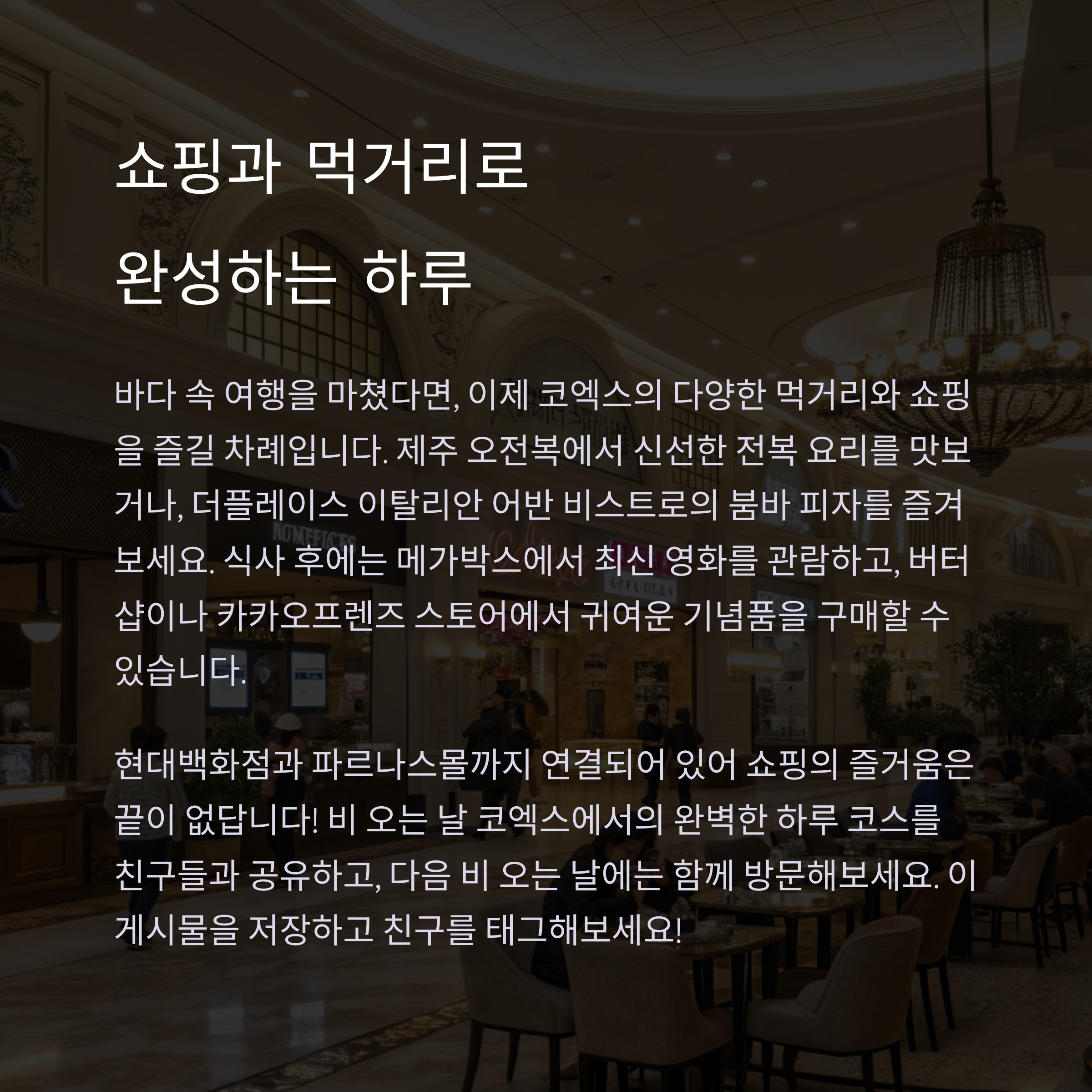 비 오는 날에도 즐겁게 하루를 보낼 수 있는 코엑스! 다양한 실내 공간과 풍부한 볼거리 덕분에 날씨 걱정 없이 가족, 친구, 연인과 함께 알찬 시간을 보낼 수 있습니다. 특히 스타필드 코엑스몰과 현대백화점, 파르나스몰까지 연결된 넓은 공간에서 영화, 쇼핑, 전시까지 한 번에 해결할 수 있어 하루 종일 즐거움을 만끽할 수 있는 것이 큰 장점입니다. 비 오는 날 우울한 기분이 들 때는 코엑스에서 특별한 하루를 보내며 여유롭게 힐링해 보세요. 색다른 경험과 감성 가득한 실내 코스가 기다리고 있습니다. 다음에도 더 알찬 여행 정보로 찾아오겠습니다! 즐거운 코엑스 나들이 되세요! 🌧️🌼