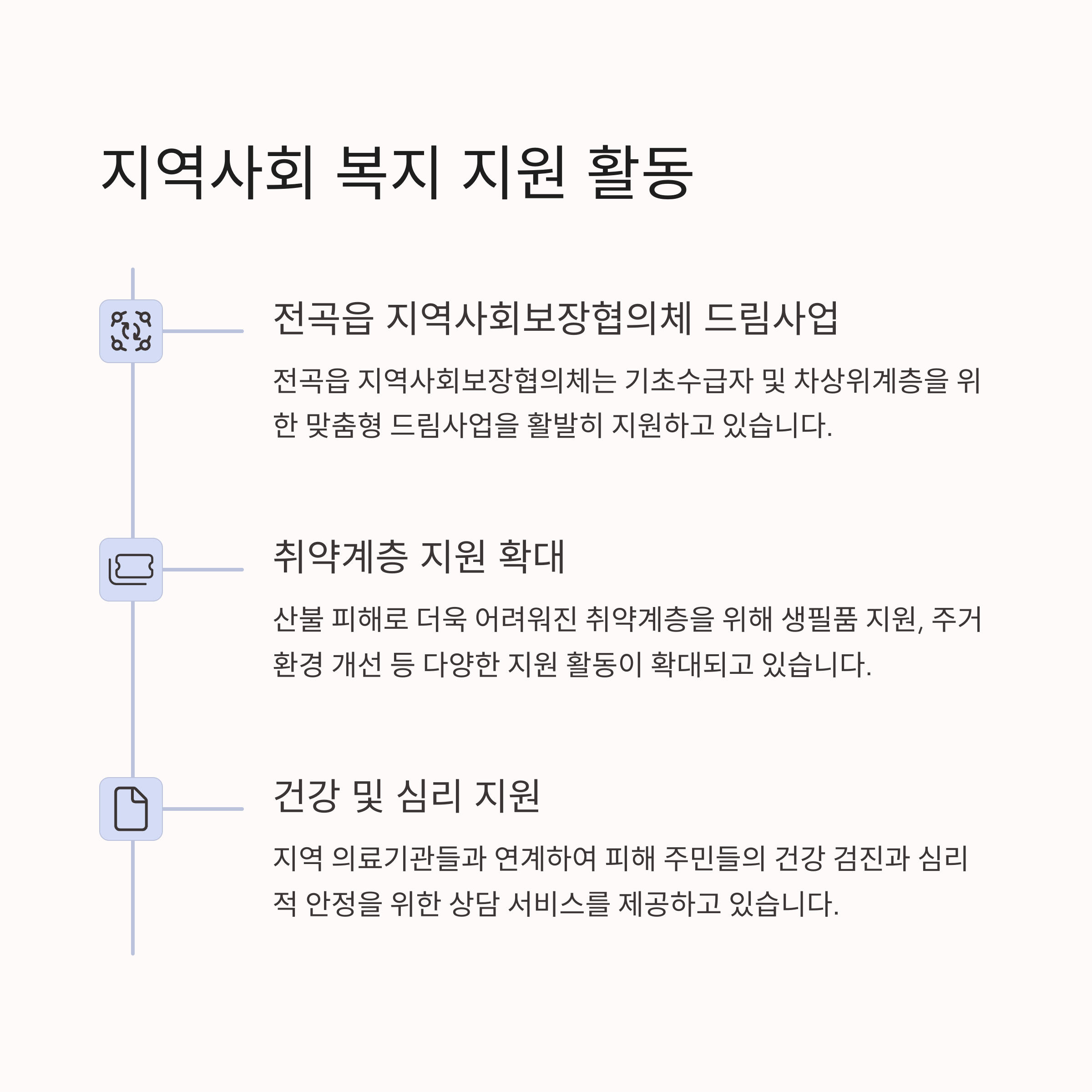 산불 피해 복구와 더불어, 각 지역에서는 복지 사각지대를 위한 지원 활동도 활발히 이어지고 있습니다. 전곡읍 지역사회보장협의체는 기초수급자 및 차상위 계층을 위한 드림사업을 통해 긴급 생계비와 생필품을 지원하고 있어요. 단발적인 지원을 넘어서 지속 가능한 복지를 만들기 위한 노력이 곳곳에서 펼쳐지고 있다는 점에서 더욱 의미가 깊습니다.