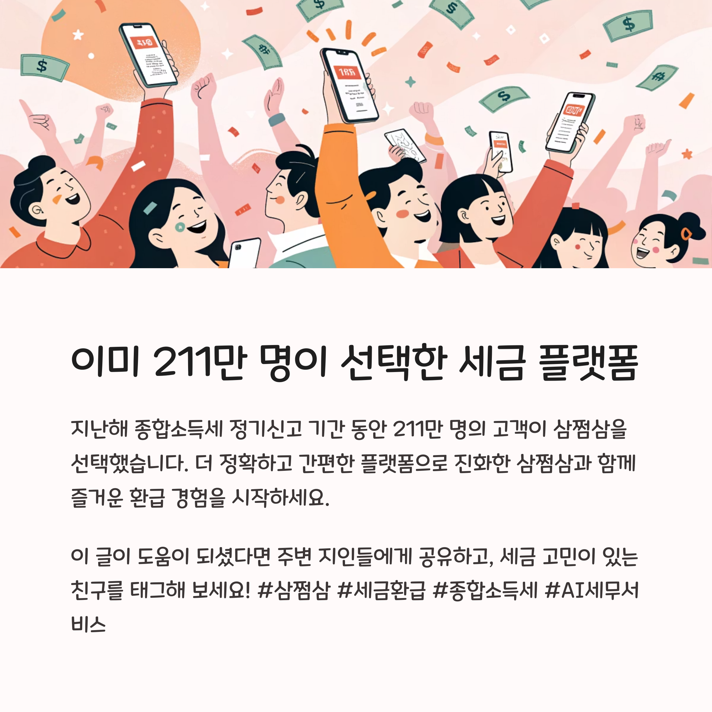 세금이라는 말만 들어도 머리가 지끈거리던 때는 이제 끝났어요. 삼쩜삼의 AI 세무 서비스는 정말이지 "이런 게 있었으면 좋겠다" 싶은 모든 걸 다 갖췄더라고요. 저도 직접 써보면서 경정청구로 추가 환급까지 받았는데, 이건 말이 필요 없는 혁신이었어요. 여러분도 이번 종소세 시즌엔 삼쩜삼과 함께, 어렵고 복잡한 세무를 빠르고 정확하게 해결해보세요. AI가 진짜로 당신의 환급을 챙겨줍니다!
