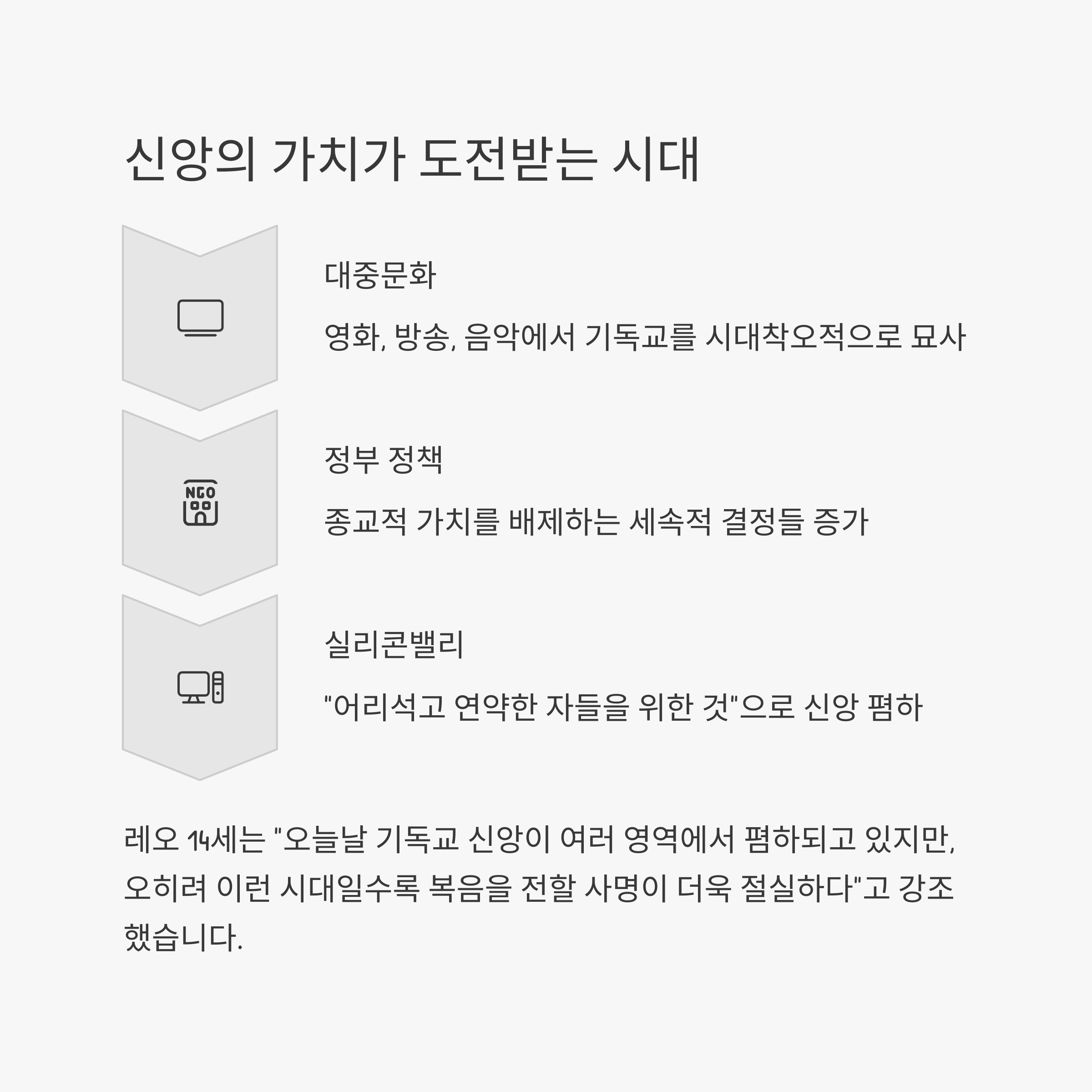 - “기술, 돈, 성공, 권력, 쾌락 같은 방어물들이 신앙을 밀어내고 있다.”