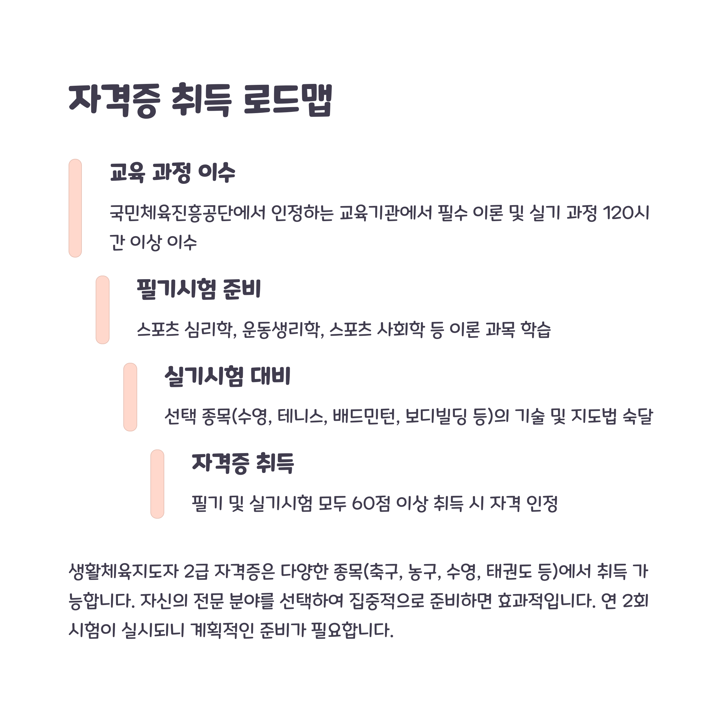 생활체육지도자 2급 자격증은 체육 지도자로서의 전문성을 인정받는 중요한 자격이에요. 국민 건강과 운동 활성화에 기여하는 만큼, 취득 후 다양한 진로가 열려 있어 도전할 만한 가치가 있습니다. 체계적인 준비와 꾸준한 연습으로 목표를 이룬다면, 체육 현장에서 활약할 여러분의 모습을 기대해 봅니다. 건강한 사회를 만들어가는 체육 전문가로 성장해 보세요!