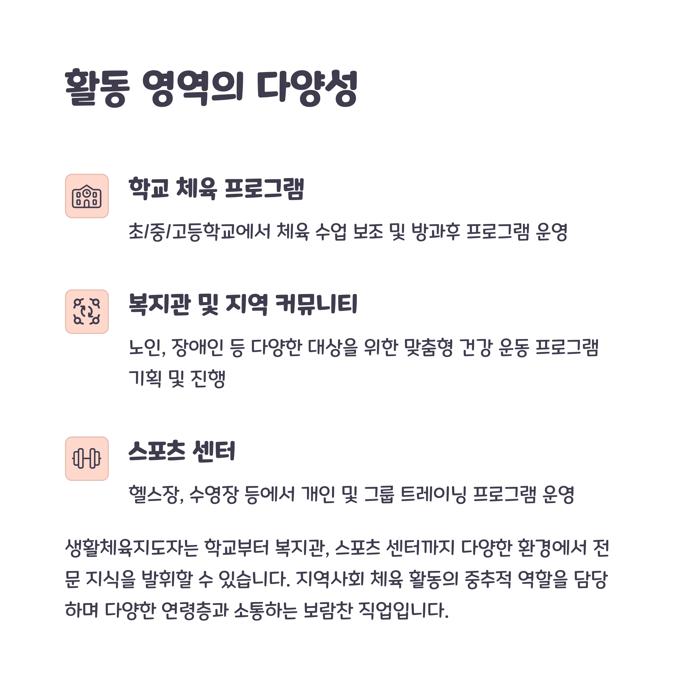 학교 체육 교실, 복지관 체육 프로그램, 스포츠센터 강사 등 다양한 현장에서 활동할 수 있습니다.