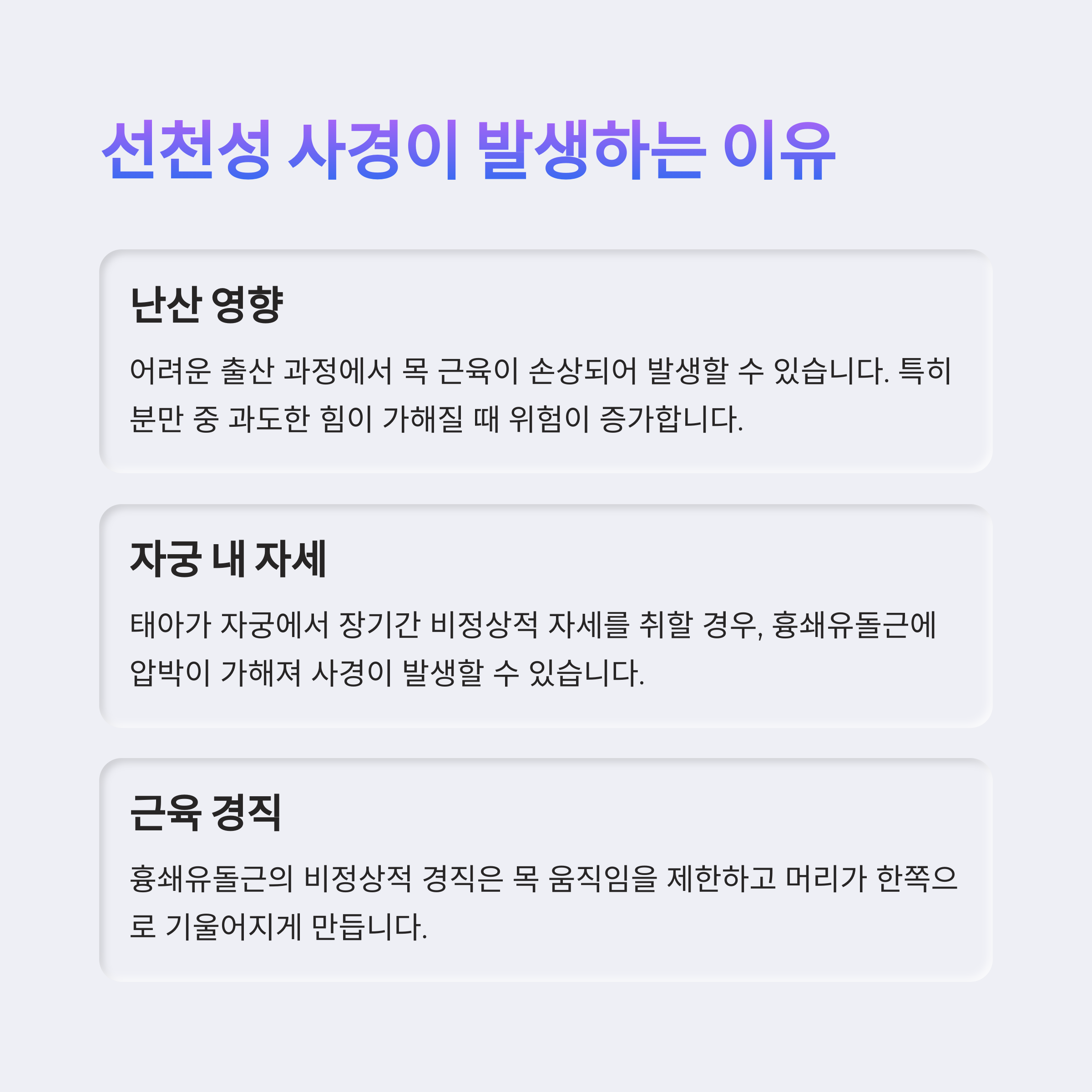 이 질환이 생기는 원인은 여러 가지가 있지만, 가장 흔한 건 출산 과정에서의 근육 손상이랍니다. 특히 난산이나 둔위 분만이었을 경우, 출산 중에 흉쇄유돌근이 손상되거나 혈종이 생기면서 근육이 굳어질 수 있어요. 또 드물게는 자궁 내 태아 자세가 비정상일 때나 선천적인 척추 이상과 연관되기도 하죠.