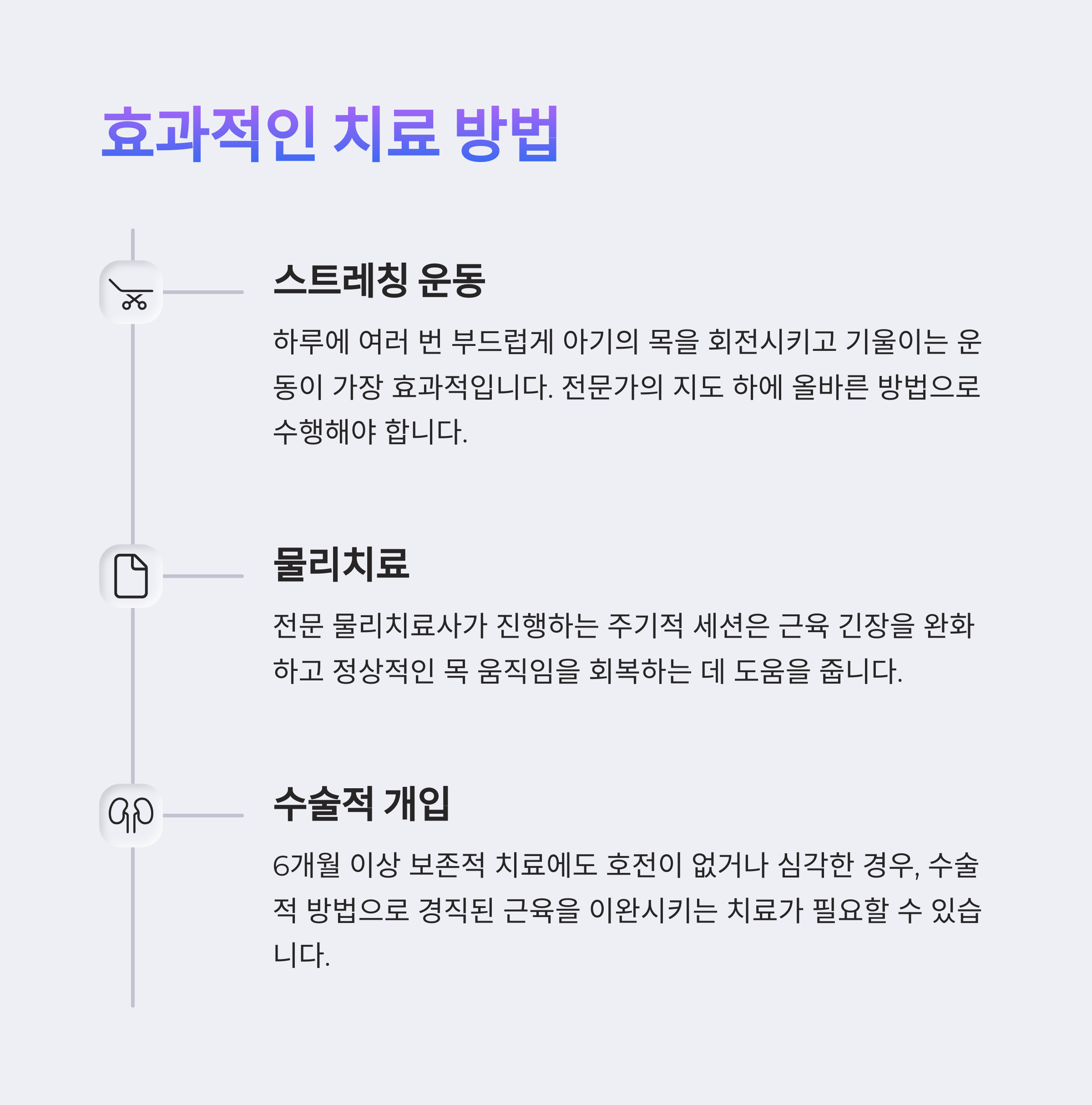 치료는 생각보다 간단하게 시작할 수 있어요. 조기에 발견만 된다면 대부분은 수술 없이 좋아질 수 있답니다. 특히 생후 2~3개월 안에 시작하면 치료 반응도 훨씬 좋고요. 보호자분들이 집에서 꾸준히 스트레칭을 시켜주는 게 핵심이에요. 물론 치료 시기를 놓치거나 근육 섬유화가 심해졌을 경우엔 수술적 치료도 고려해야 하죠.
