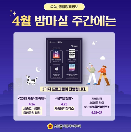 2025년 4월 밤마실 주간에는 과학과 음악, 지역상권 이벤트까지 다채로운 프로그램이 준비되어 있습니다. 특히 세종과학축제와 음악감상회는 세종시만의 고유한 색깔이 담긴 콘텐츠로, 가족 단위 방문객은 물론 야간 데이트를 계획 중인 커플에게도 좋은 기회가 될 거예요. 행사는 대부분 무료로 참여 가능하며, 자세한 일정은 세종시의회 홈페이지에서도 확인할 수 있습니다.