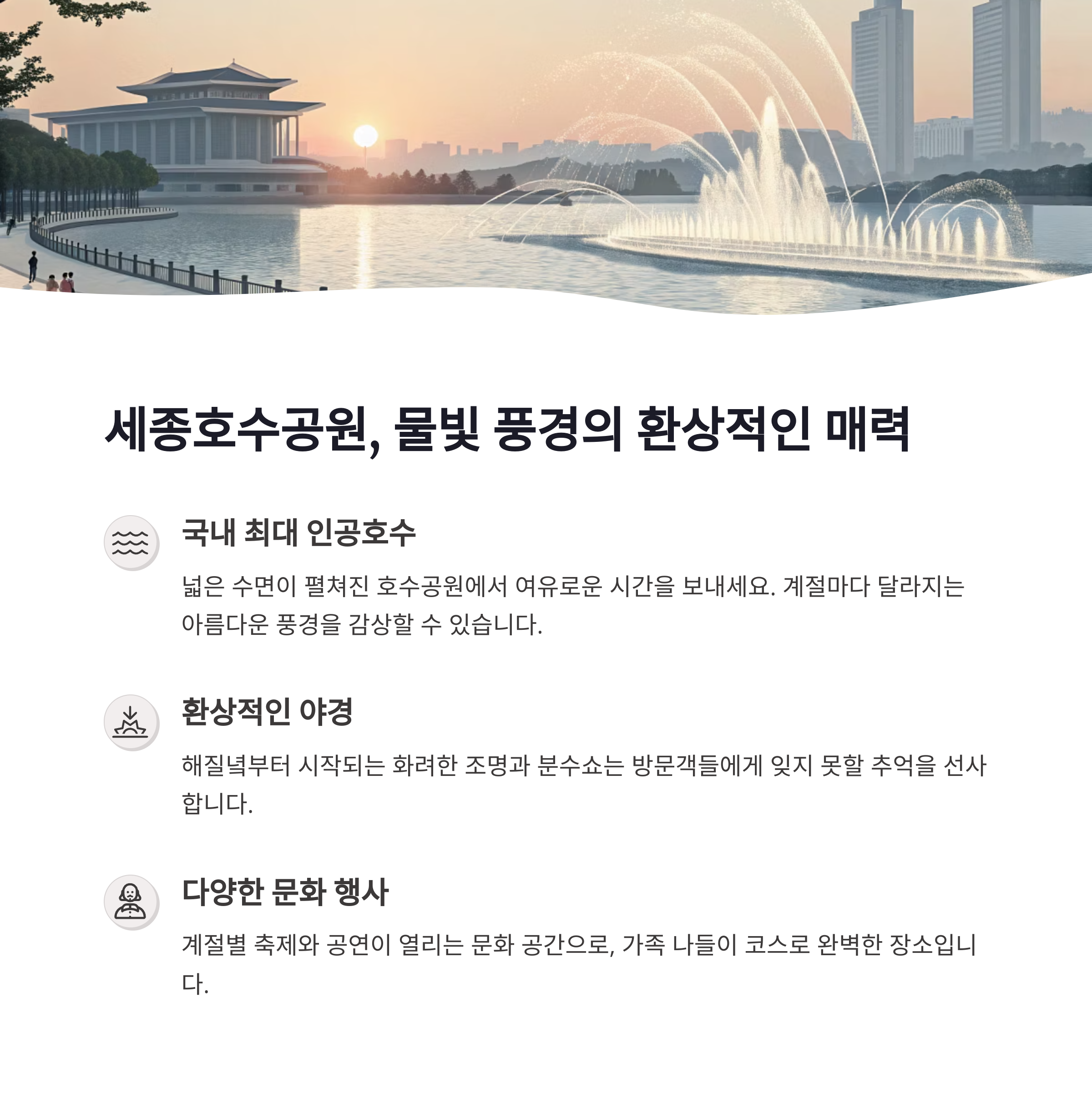 세종호수공원은 세종시의 대표적인 랜드마크이자, 전국 최대 규모의 인공호수공원입니다. 총 면적 69만㎡에 이르는 이곳은 낮에는 여유로운 산책 코스로, 밤에는 조명과 야경이 어우러진 포토 명소로 변신합니다. 곳곳에 설치된 예술 조형물, 분수대, 나무데크길, 잔디광장은 가족 단위는 물론 연인들 데이트 장소로도 인기가 높습니다. 주말에는 마켓이나 공연이 열릴 때도 많아 시간 가는 줄 모르고 머물 수 있는 공간이에요.