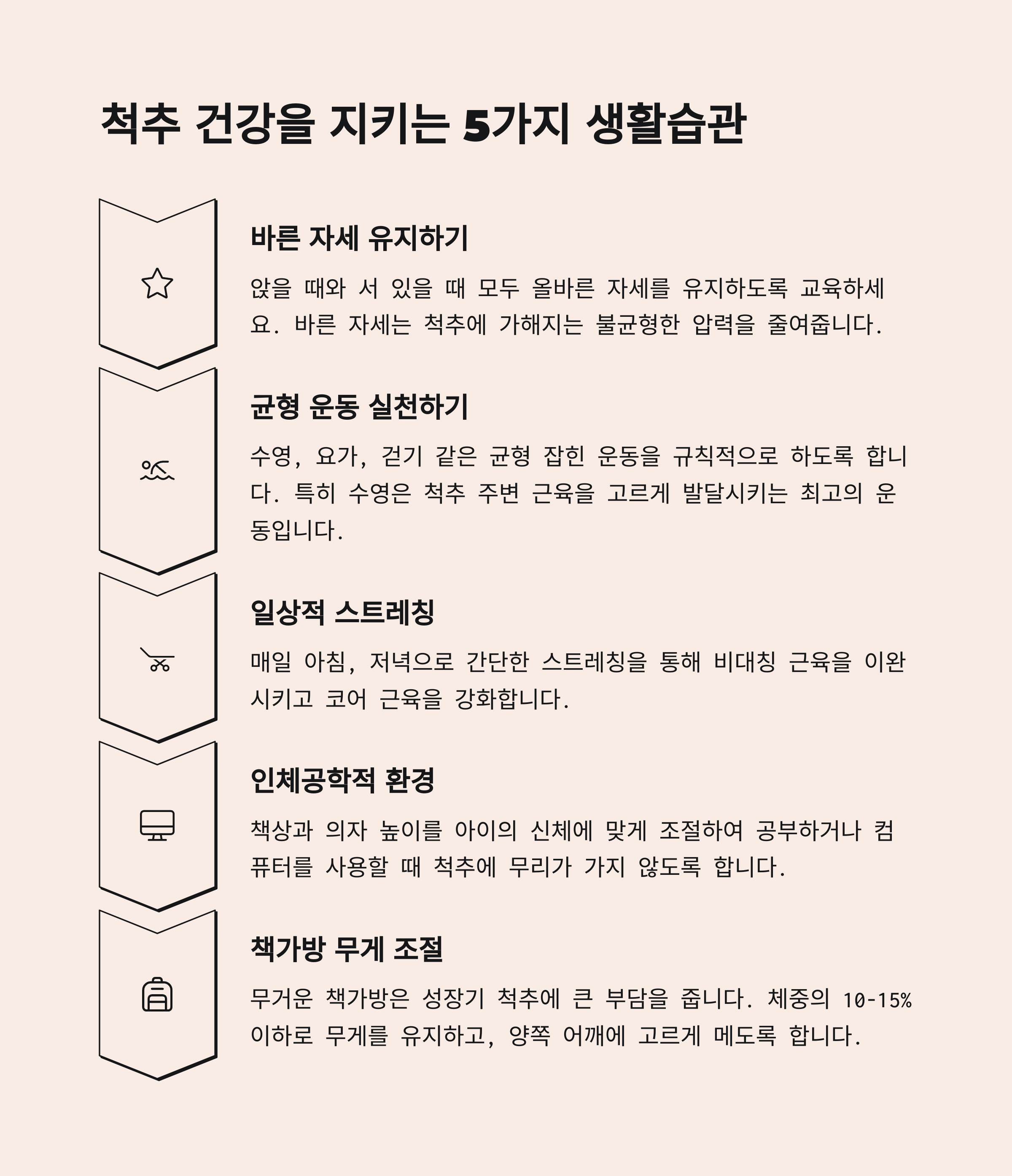 우리는 아이들의 작은 행동 하나에도 의미를 담고 싶어 하죠. 오늘 이야기한 생활습관들 역시, 그저 일상처럼 보이지만 아이의 미래를 결정짓는 중요한 선택일 수 있어요. 가끔은 "이 정도쯤이야" 하고 지나칠 수도 있지만, 그 순간들이 쌓여 아이의 척추 건강을 지키거나 놓치는 갈림길이 되기도 하거든요. 지금 당장은 불편하고 번거로울 수 있어도, 건강한 성장은 결국 그 '불편함을 감수한 순간들'에서 비롯된다는 걸 우리 모두 잊지 않았으면 해요.