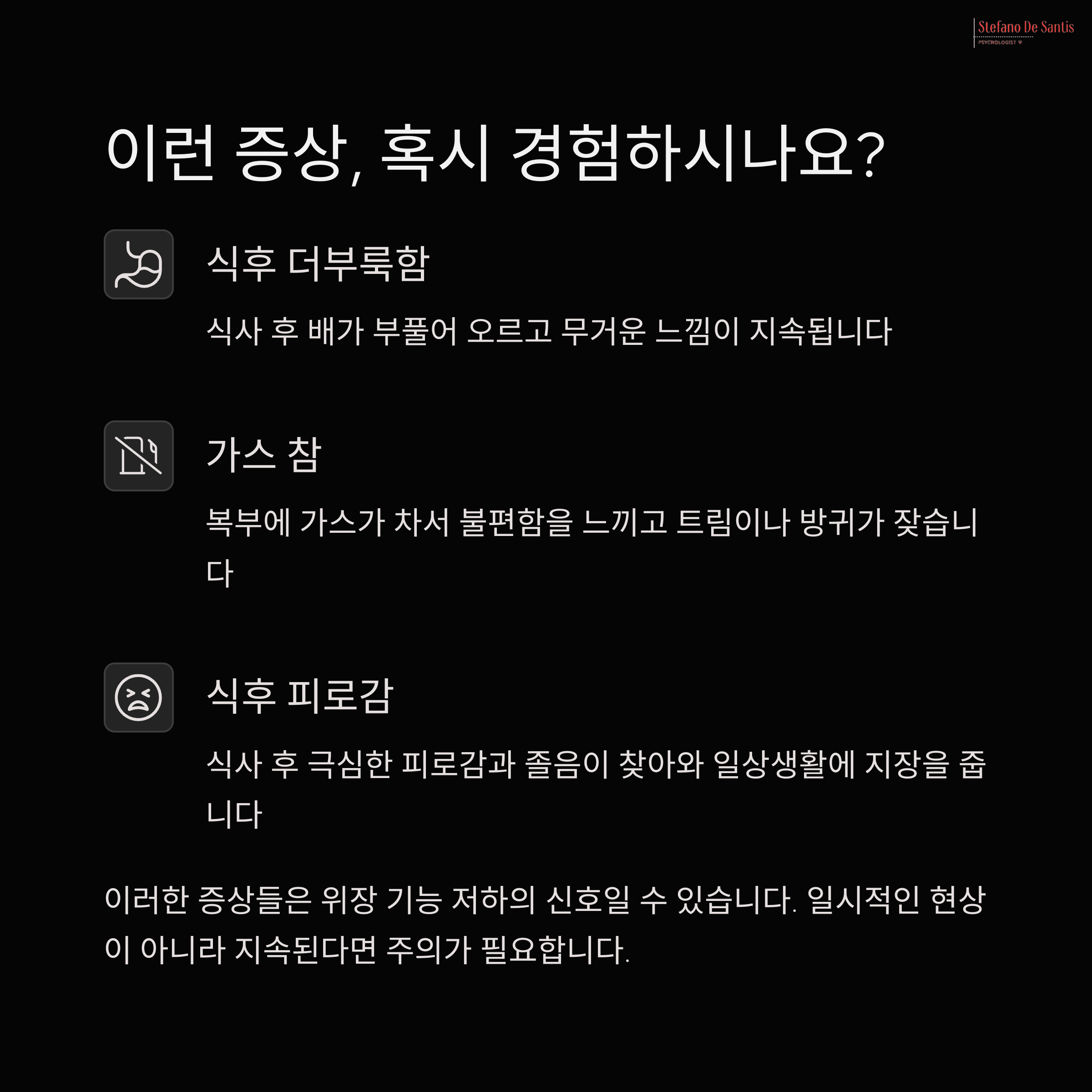 소화 기능에 문제가 생기면 단순히 속이 불편한 것뿐 아니라, 에너지 저하, 피부 트러블, 수면 장애 등 전신 증상으로 이어질 수 있어요. 아래 체크리스트를 통해 나의 소화 건강 상태를 간단하게 확인해보세요. 3개 이상 YES라면 위장 기능이 약해졌다는 신호일 수 있습니다.