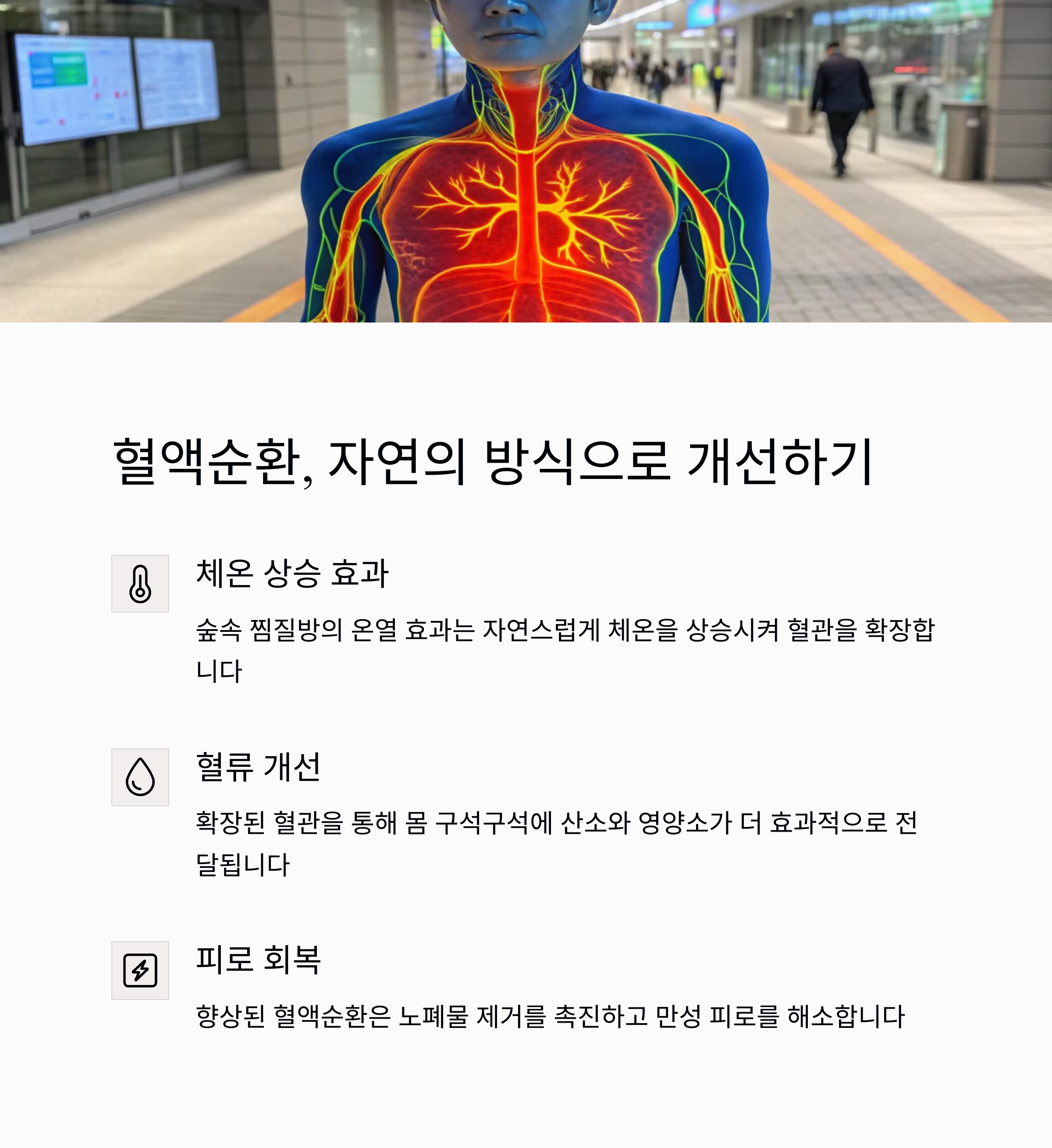 숲속 찜질방의 온열 요법은 체온을 상승시켜 혈관을 확장하고, 혈액순환을 촉진합니다. 이로 인해 산소와 영양소 공급이 원활해지며, 근육의 피로가 완화되어 몸이 한결 가벼워집니다. 특히 냉증이나 만성 피로를 느끼는 분들에게 큰 도움이 됩니다.