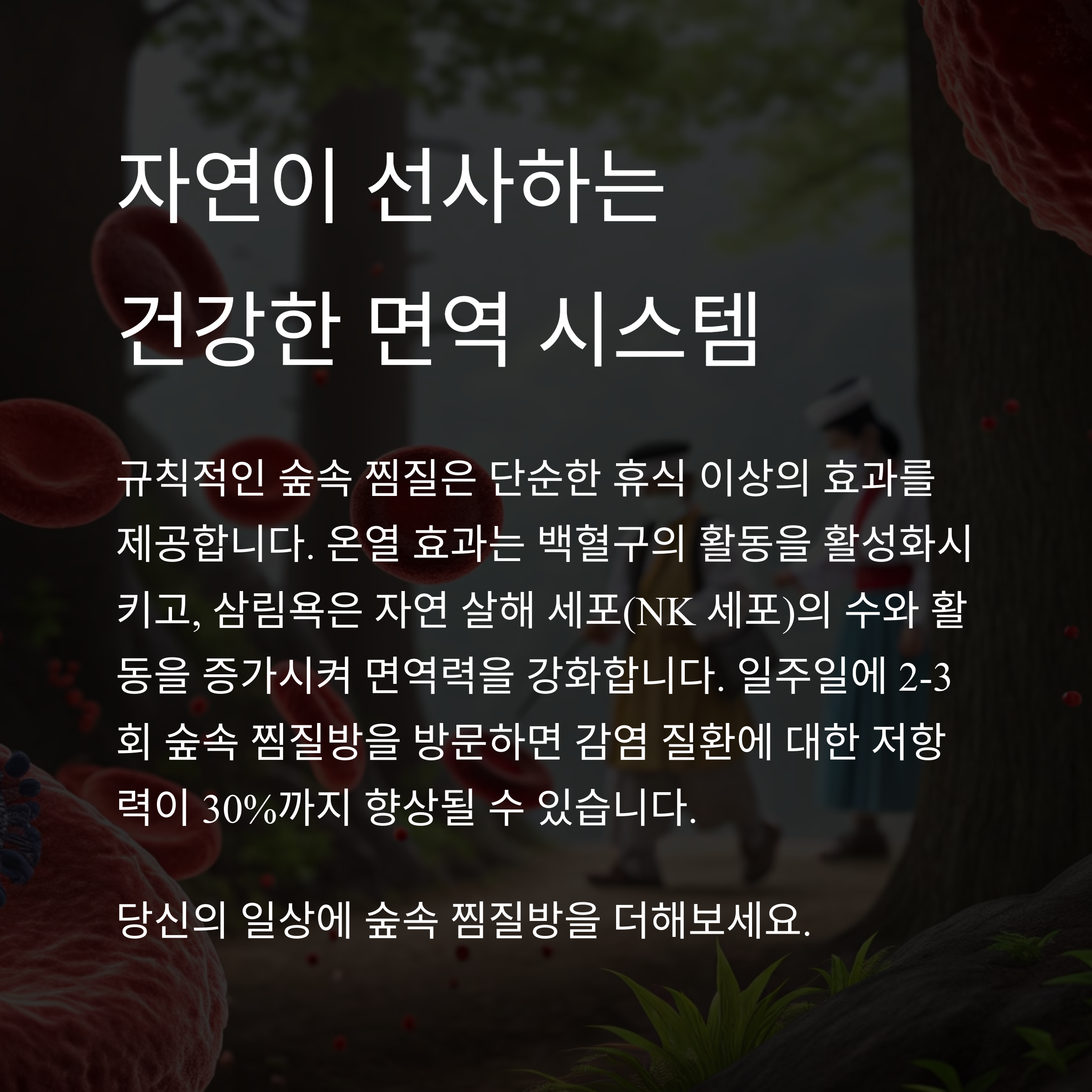 안녕하세요! 오늘은 자연 속에서 힐링과 건강을 동시에 챙길 수 있는 특별한 공간인 숲속 찜질방에 대해 소개합니다. 삼림욕과 온열 요법이 결합된 숲속 찜질방은 현대인의 스트레스를 해소하고 면역력을 높이는 데 효과적입니다. 체온 상승과 피톤치드 흡입을 통해 혈액순환 개선과 심신 안정까지 한 번에! 자연의 치유력을 경험할 수 있는 숲속 찜질방의 놀라운 효과를 함께 알아볼까요?
