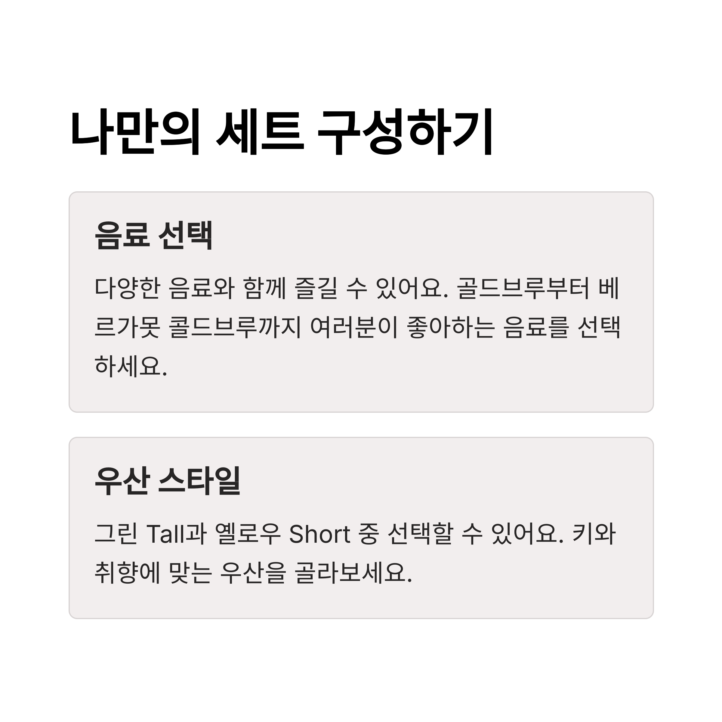 - Q. 우산만 따로 구매 가능한가요? → 불가능합니다. 반드시 음료 세트로 구매하셔야 해요.