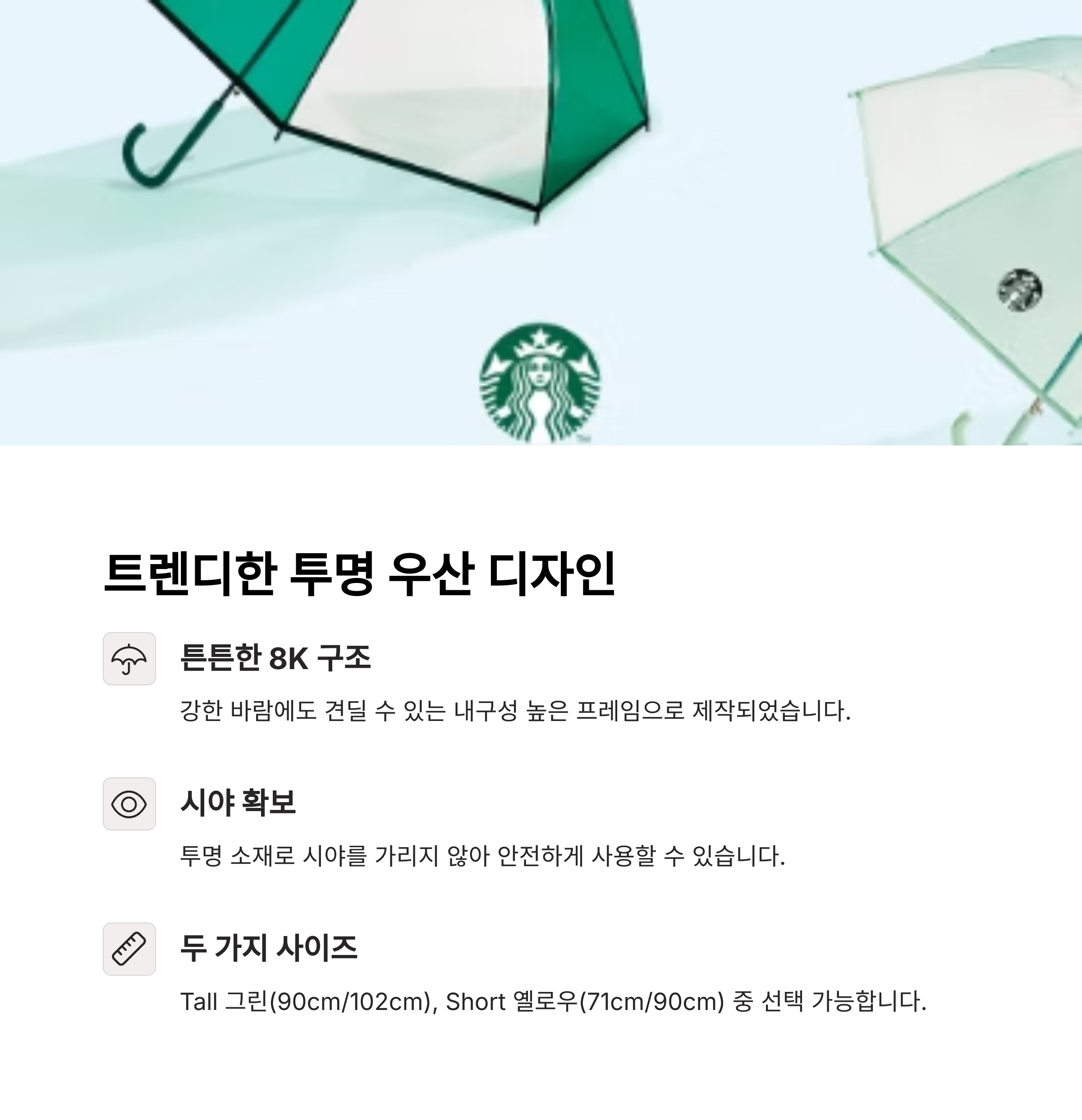 우산이라고 가볍게 볼 수는 없죠. 이번 스타벅스 우산은 단순히 디자인뿐만 아니라 기능성에서도 뛰어납니다. 8K 구조의 고강도 프레임은 바람에도 잘 휘지 않고, 투명 원단은 시야 확보에 탁월해 실용성을 높였어요. 손잡이의 컬러 포인트는 미끄러짐을 줄이고, 가벼운 무게감으로 휴대성까지 갖췄습니다.