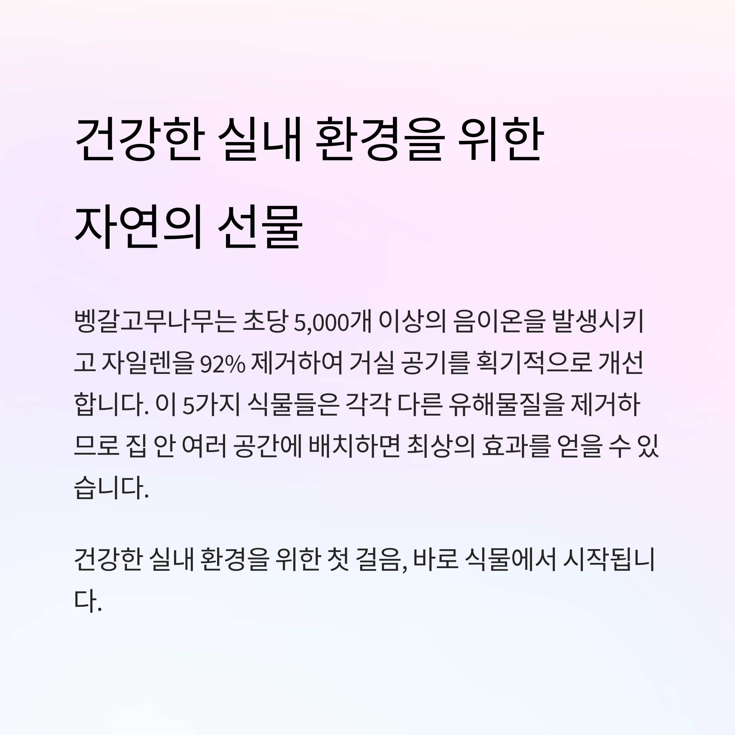 식목일을 맞아 실내 공기를 정화하고 건강을 지킬 수 있는 식물을 소개해드렸습니다. 실내 식물은 단순한 장식용이 아니라 공기 중 유해 물질을 제거하고 습도를 조절하여 건강한 생활 공간을 만들어줍니다. 특히 스파티필럼, 아이비, 관음죽, 스킨답서스, 벵갈고무나무는 관리도 쉽고 공기 정화 효과도 뛰어나 실내 공간 어디에 두어도 좋은 선택입니다.
