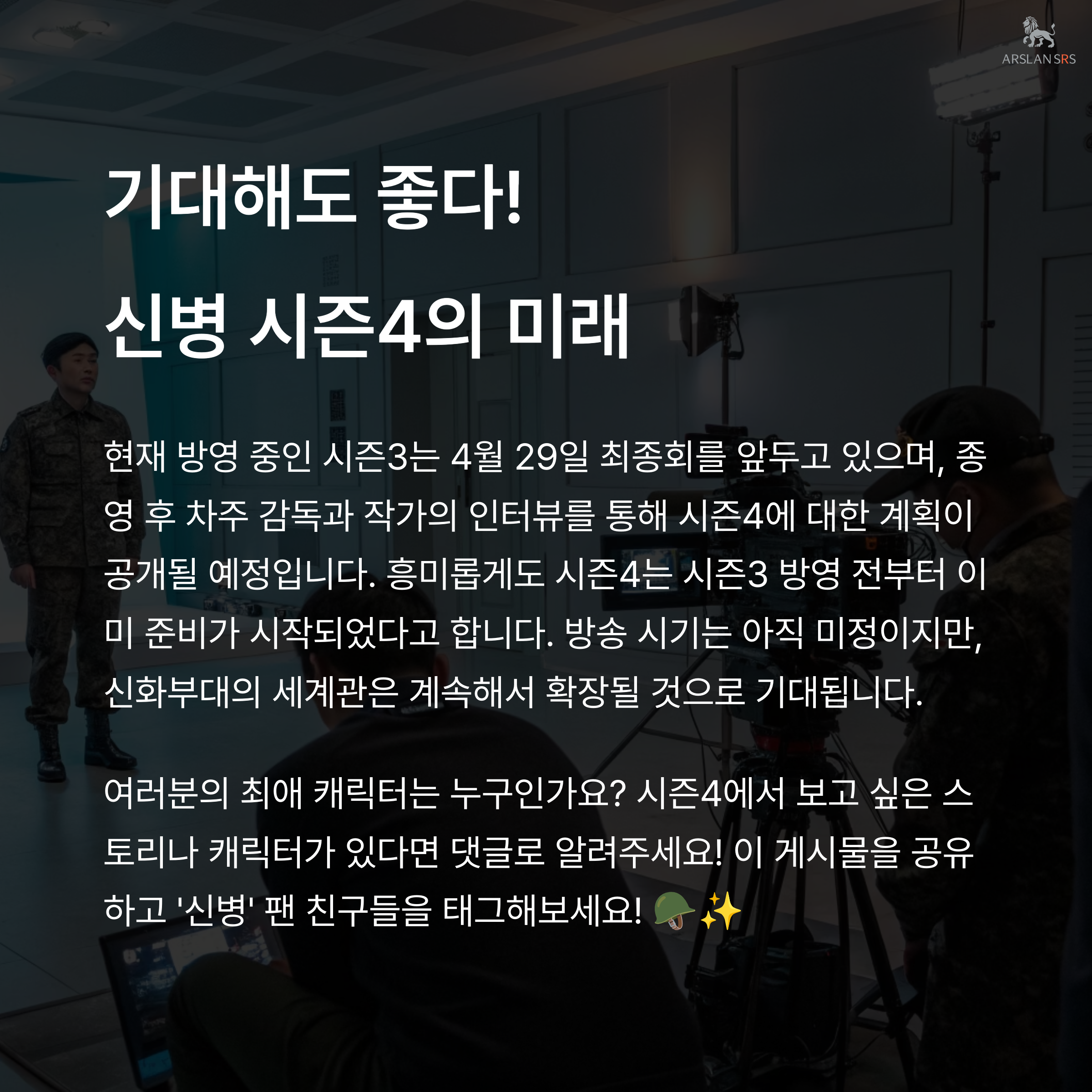 2024년 4월 25일, KT스튜디오지니는 공식 보도자료를 통해 ‘신병 시즌4’의 제작을 확정 지었습니다. 이미 시즌3가 방영 중임에도 불구하고 시즌4를 예고한 건, 작품에 대한 자신감과 팬들의 반응을 반영한 결과로 해석됩니다. 감독과 작가 인터뷰는 다음 주 예정되어 있어, 시즌4에 대한 구체적인 내용은 아직 베일에 싸여 있지만 “신화부대 세계관이 이어진다”는 한마디만으로도 팬들의 기대감은 최고조에 달한 상황입니다.