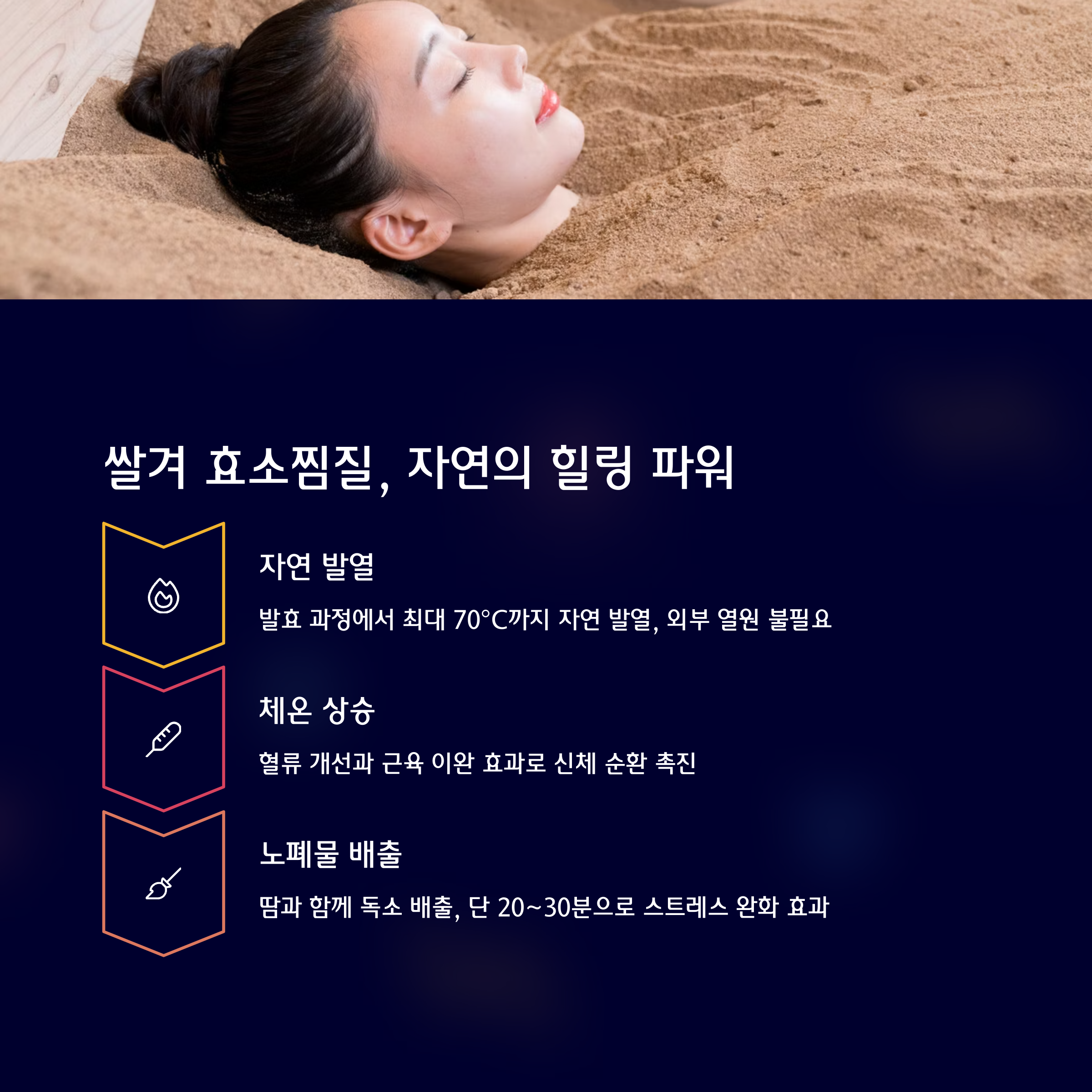 자연 발효열은 서서히 상승하며 인체에 무해하나, 민감 체질일 경우 직원 안내에 따라 시간 조절이 필요합니다.