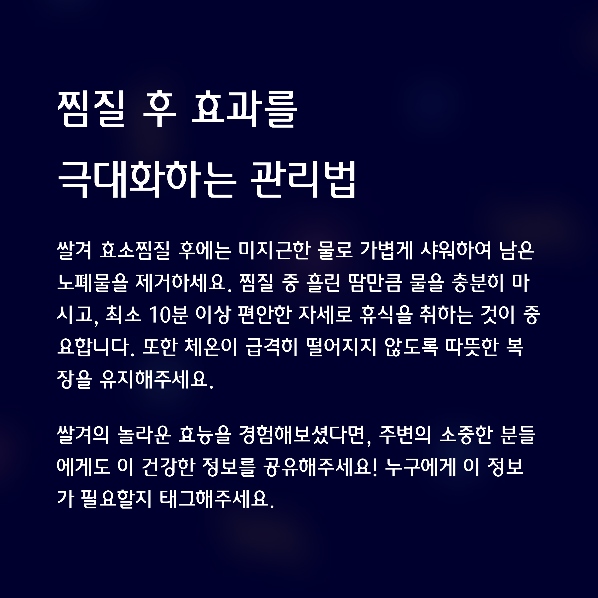 - 찜질 전후 충분한 수분 섭취로 탈수를 방지하세요.