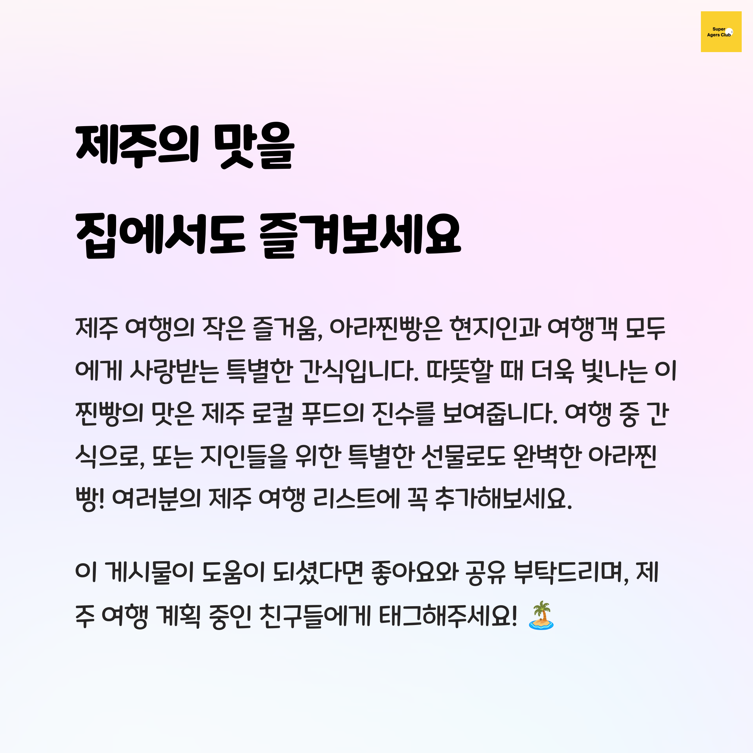 제주 여행 중 간식으로 무엇을 선택할지 고민이라면, 아라찐빵은 단연코 추천할 만한 별미입니다. 현지인도 인정한 그 맛과 품질 덕분에 제주를 떠올리면 자연스럽게 생각나는 간식이 될 거예요. 특히 따뜻할 때 한입 베어 물면 느껴지는 달콤함과 촉촉함은 정말 잊을 수 없습니다. 빅대디여행에서도 강력 추천하는 이유를 직접 경험해보세요. 여행의 피로를 한 방에 날려줄 아라찐빵으로 제주에서의 시간을 더욱 특별하게 만들어보세요!