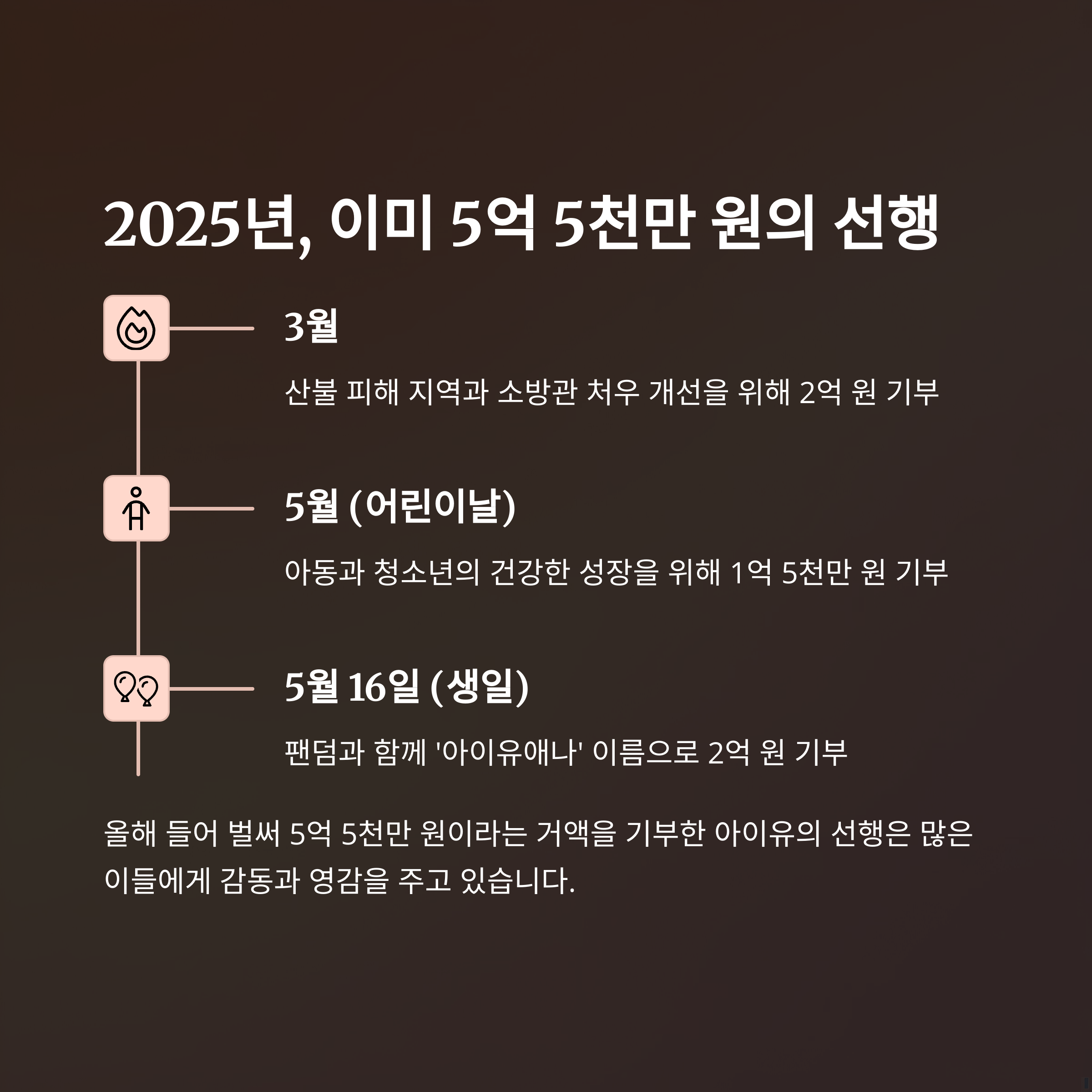 아이유는 이번 생일 기부 외에도 2025년 한 해 동안 이미 두 차례나 의미 있는 기부를 진행했습니다.