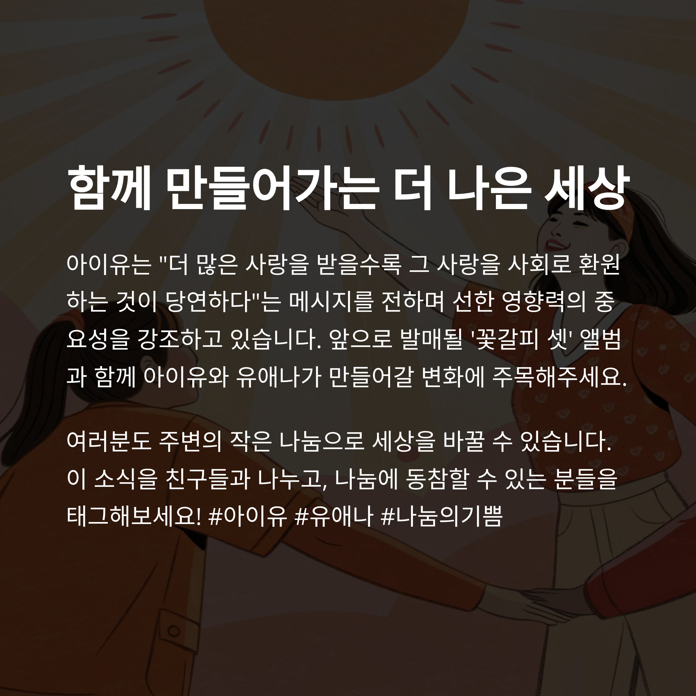 - 온라인 커뮤니티 반응: “이런 선한 영향력은 응원할 수밖에”, “아이유도 유애나도 멋져요” 등 칭찬 릴레이