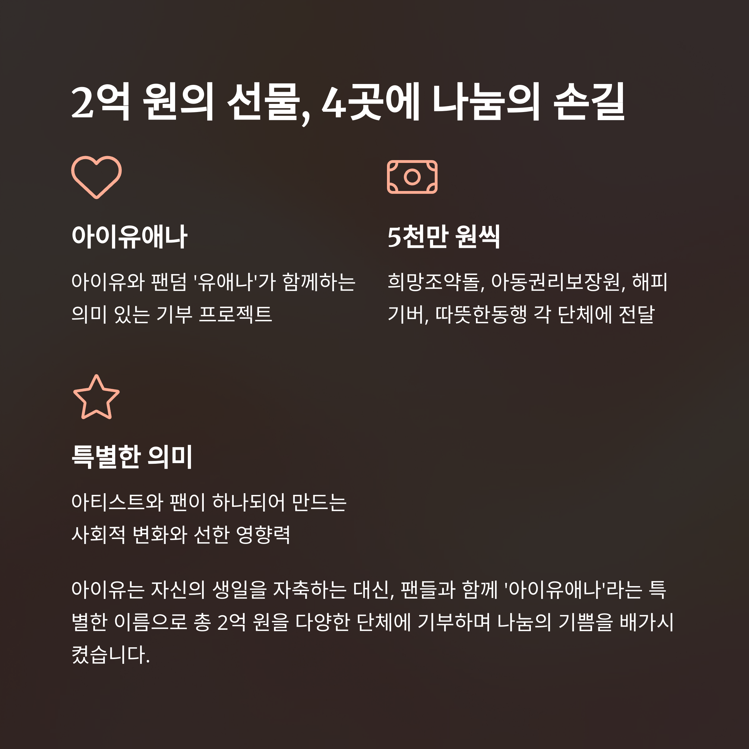 오늘도 팬들의 사랑을 잊지 않는 한 사람이 있습니다. 바로 가수 겸 배우 아이유(이지은)입니다. 그녀는 자신의 생일을 기념해 총 2억 원을 기부하며 선한 영향력을 다시 한 번 입증했는데요. 이번 기부는 ‘아이유애나’라는 이름으로 팬들과 함께한 의미 있는 선행으로, 그 감동의 여운은 국내를 넘어 전 세계 유애나의 마음을 울리고 있습니다. 따뜻한 이야기를 지금부터 함께 살펴볼까요?