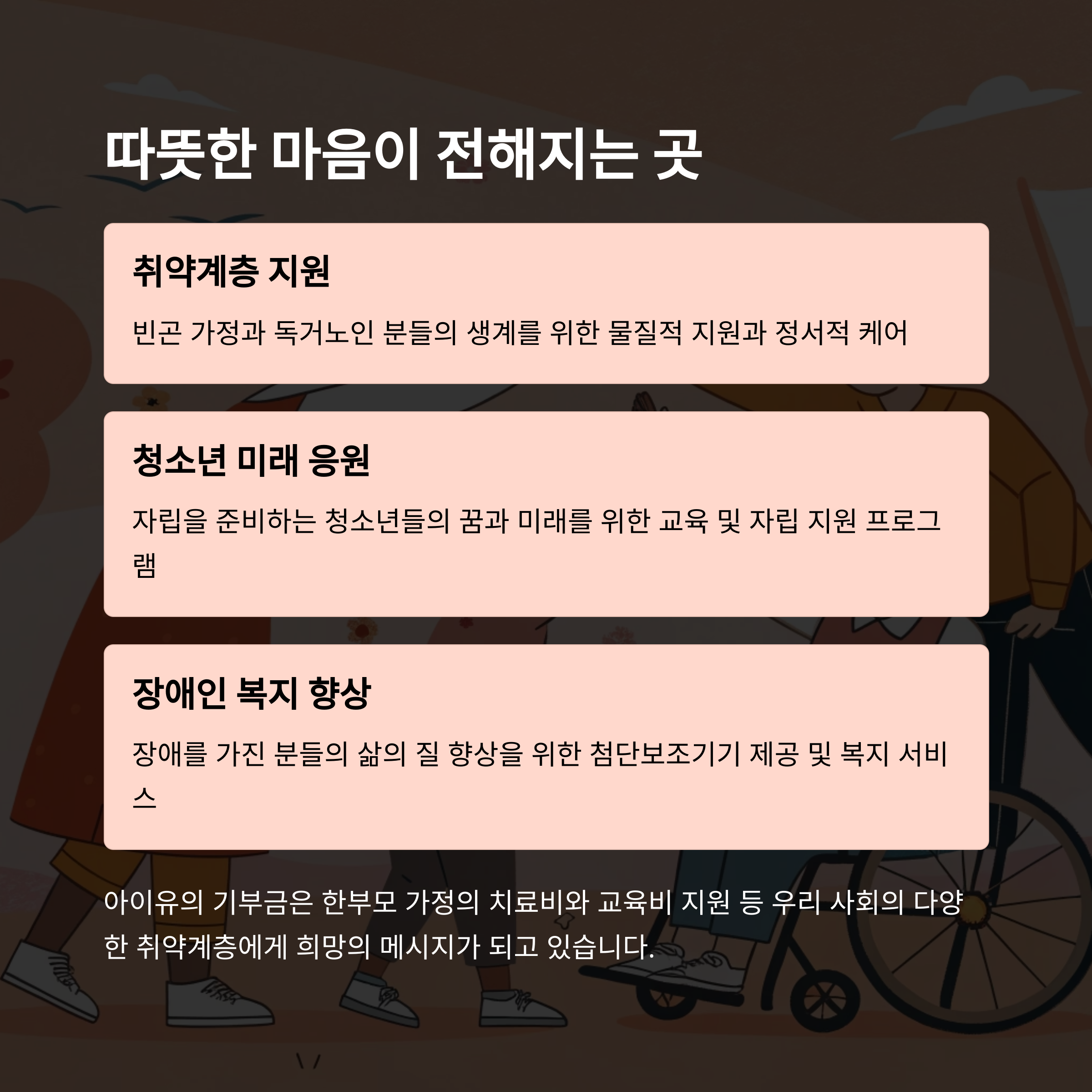 2025년 5월 16일, 아이유는 자신의 생일을 맞아 특별한 방식으로 의미를 더했습니다. 그녀는 팬클럽 ‘유애나’와 함께 ‘아이유애나’라는 이름으로 총 2억 원을 기부했는데요. 기부금은 단순히 한 곳에 쓰이는 것이 아닌, 우리 사회 다양한 계층을 향한 다방면의 지원에 사용될 예정입니다. 저소득 가정의 생계비 지원, 독거노인의 생활 안정을 위한 기초 물품 제공, 한부모 가정의 치료비와 교육비, 그리고 장애인을 위한 첨단 보조기기 및 공간 복지 개선 등 총체적인 기부 구조가 특징입니다. 이처럼 세심한 기부는 단순한 ‘돈의 전달’이 아닌, 삶의 질 개선을 돕는 실질적 행동으로 평가받고 있습니다.