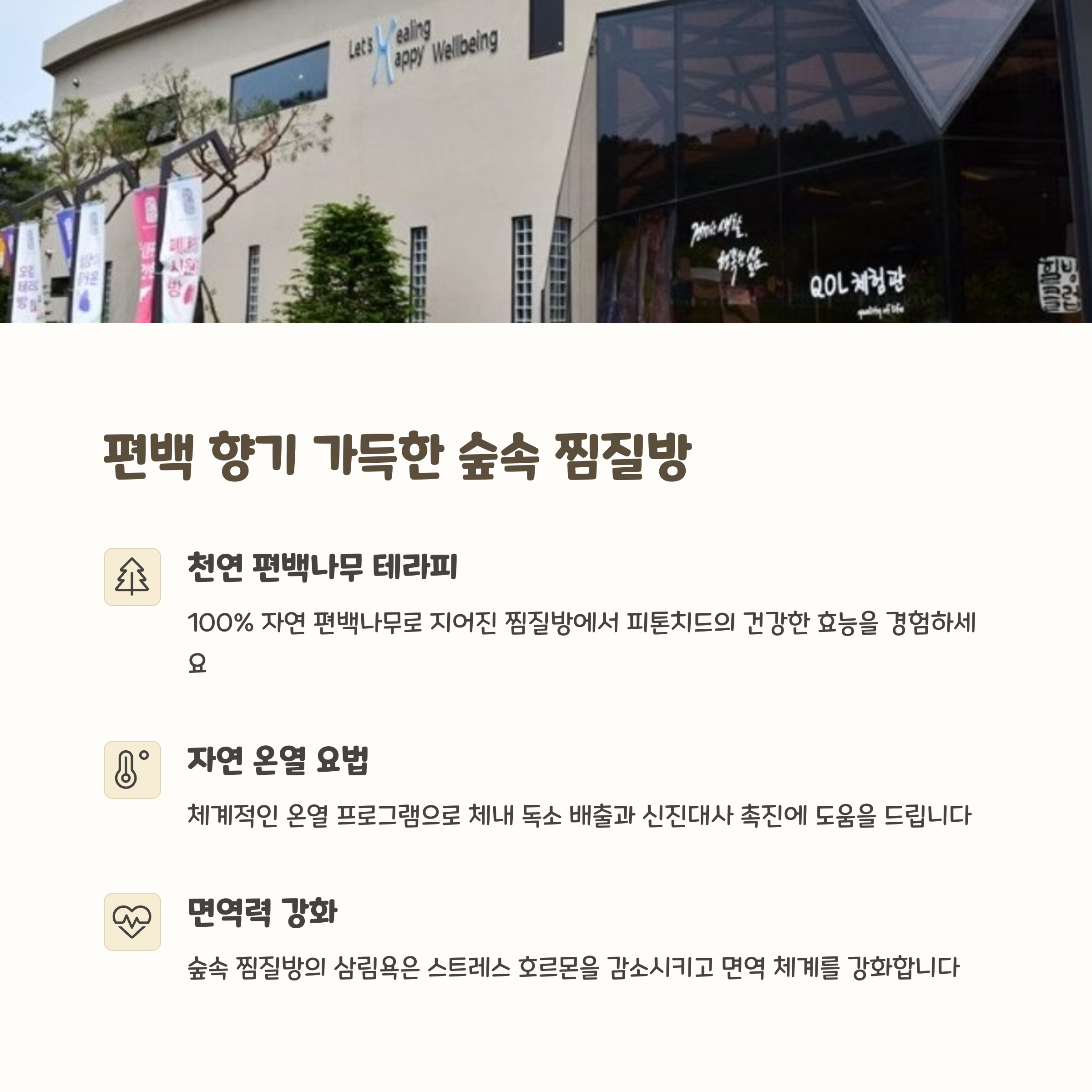 | 편백 찜질방 | 독소 배출 | 피로 회복에 도움 |