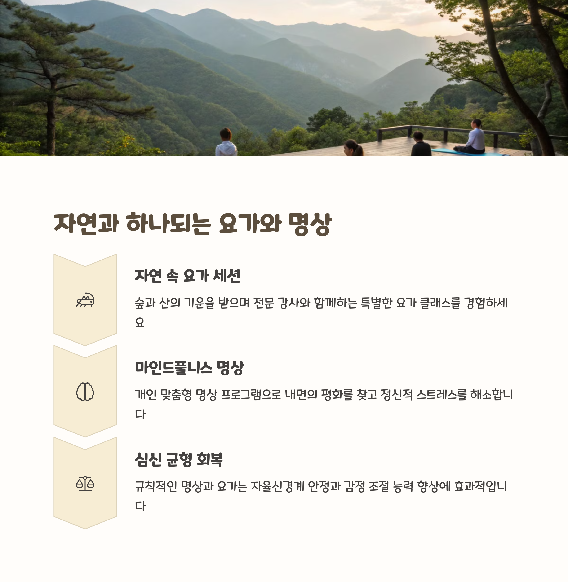 자연 속에서 진행되는 명상과 요가 세션은 몸과 마음의 균형을 잡아줍니다. 조용한 숲속에서 심호흡과 스트레칭을 통해 스트레스 해소와 정신 안정에 큰 도움이 됩니다. 특히 아침 요가 시간에는 맑은 공기를 마시며 하루를 상쾌하게 시작할 수 있습니다.
