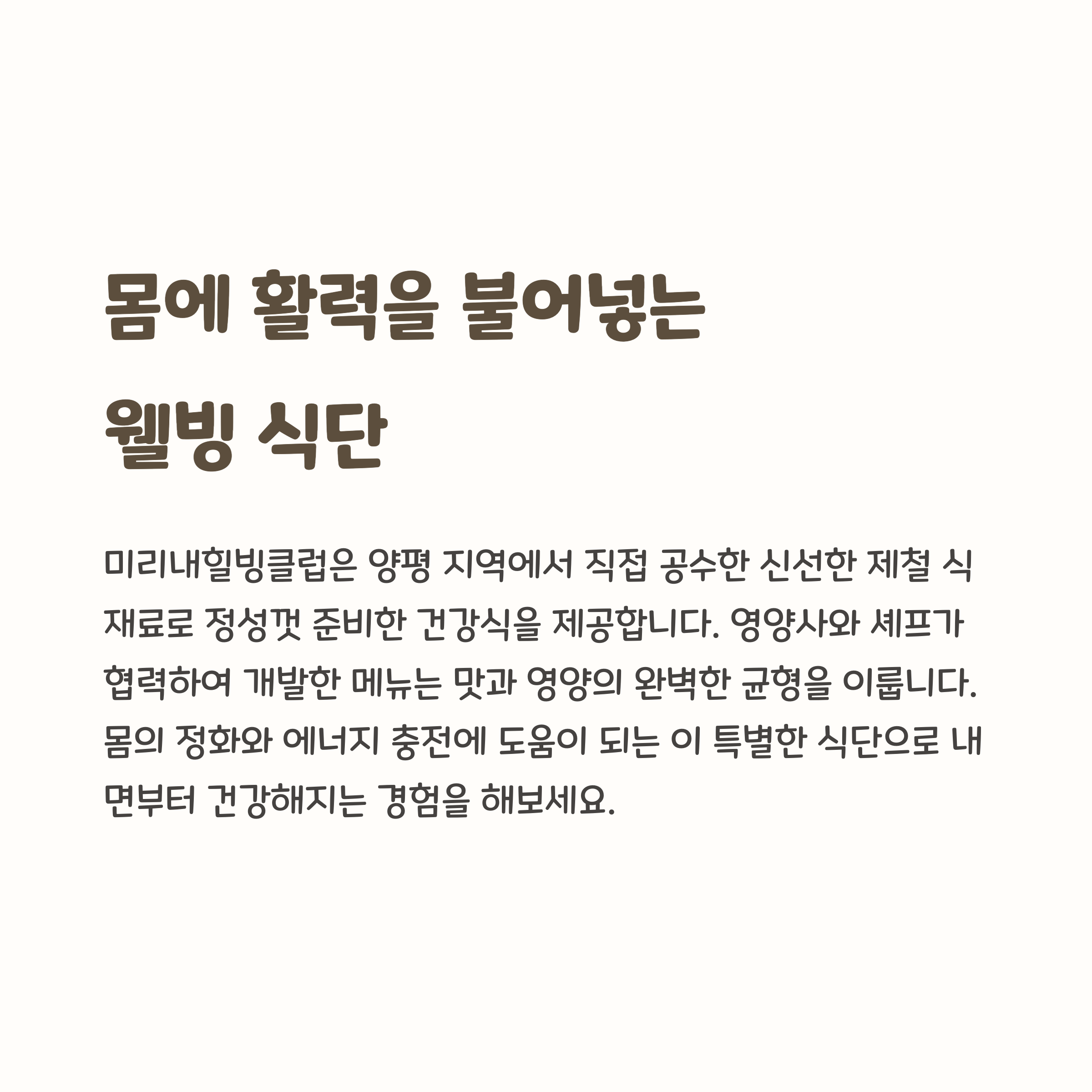 양평 봉미산 자락의 미리내힐빙클럽은 자연과 건강을 함께 즐길 수 있는 힐링 명소입니다. 편백나무 숲속 찜질방에서 피로를 풀고, 명상과 요가로 심신을 안정시킨 뒤 건강한 식단으로 에너지를 채워보세요. 자연과 힐링이 어우러진 이곳에서 몸과 마음 모두 새롭게 충전할 수 있습니다.