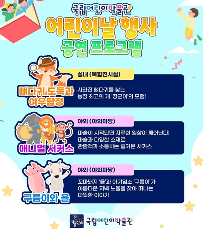 아래는 이번 어린이날 국립어린이박물관에서 선보이는 대표 공연 3종입니다. 공연 주제부터 시간, 장소까지 미리 확인해두세요.