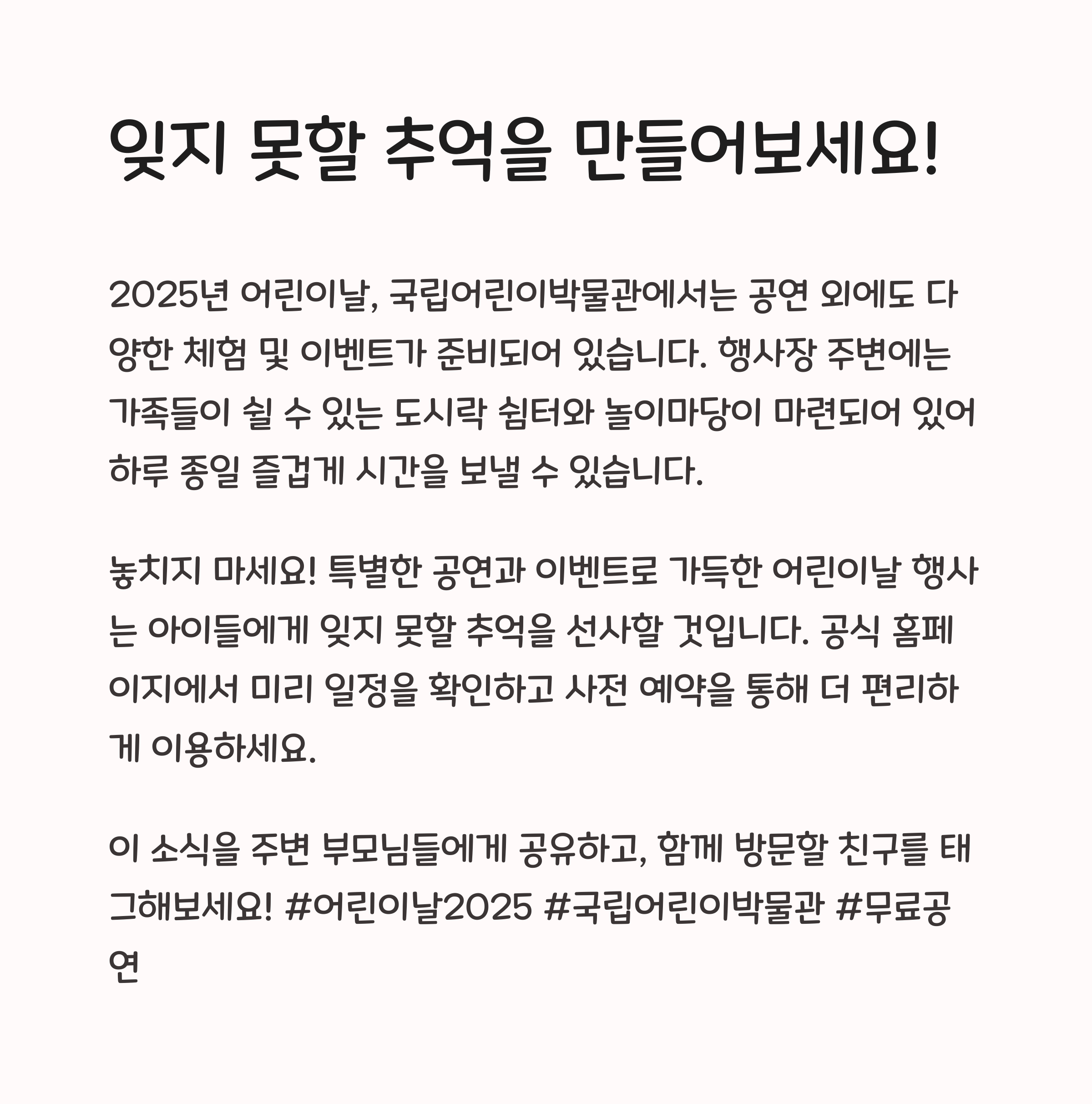 올해 어린이날, 아이에게 어떤 추억을 남겨주고 싶으신가요? 북적이는 인파 대신, 감성 가득한 문화공간에서 조용히 즐기는 하루. 국립어린이박물관에서의 무료 공연은 단순한 볼거리를 넘어, 가족이 함께 교감할 수 있는 소중한 시간이 되어줄 거예요. 저도 예전에 조카와 함께 박물관 공연을 다녀온 적이 있는데요, 공연이 끝나고 “또 보고 싶어!” 하던 그 말이 아직도 귀에 맴돌아요. 올해 어린이날, 소중한 시간을 세종 도심 속에서 특별하게 만들어보세요.