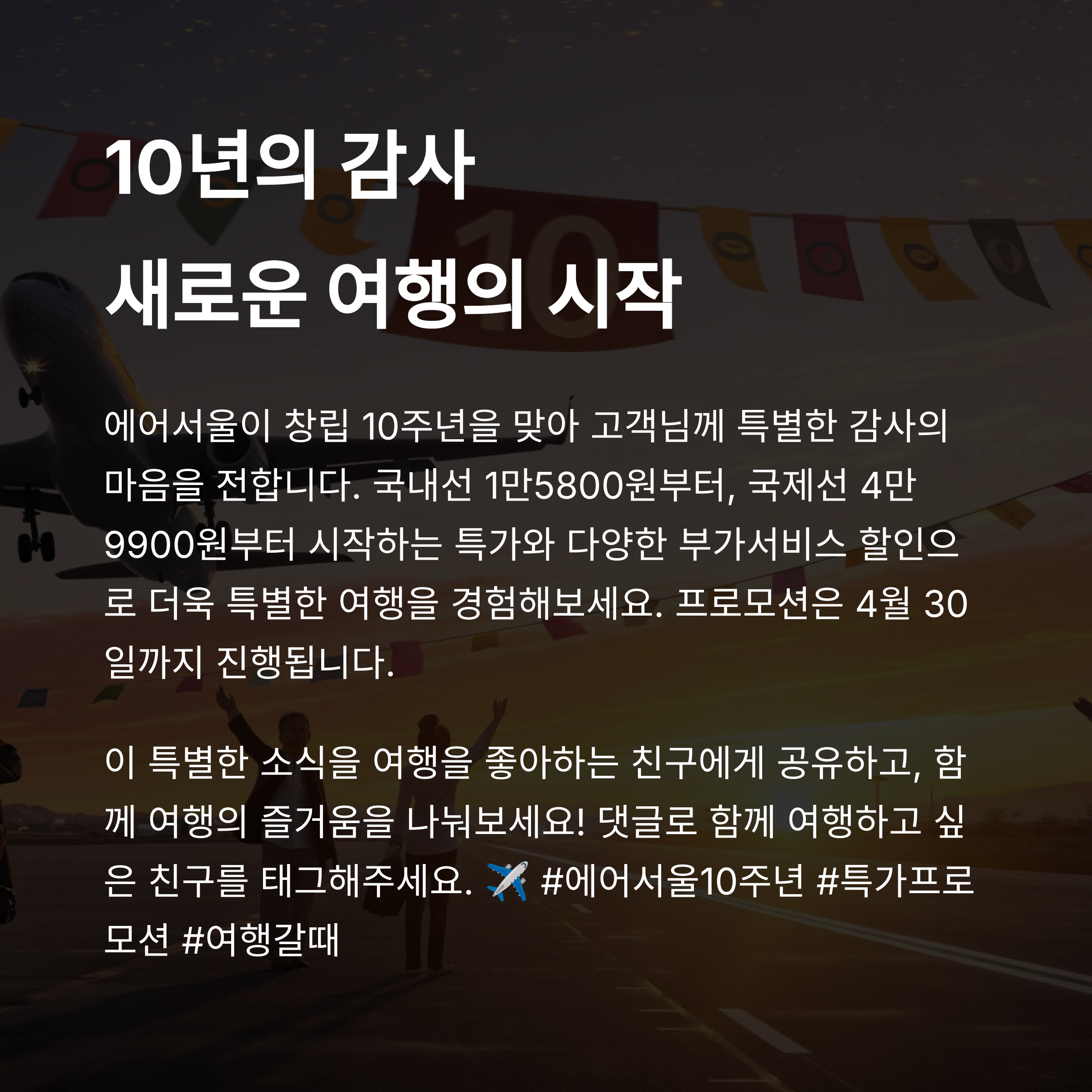 에어서울 창립 10주년 기념 프로모션 기간 동안 다양한 여행 플랫폼과 제휴하여 할인 혜택을 확대했습니다.