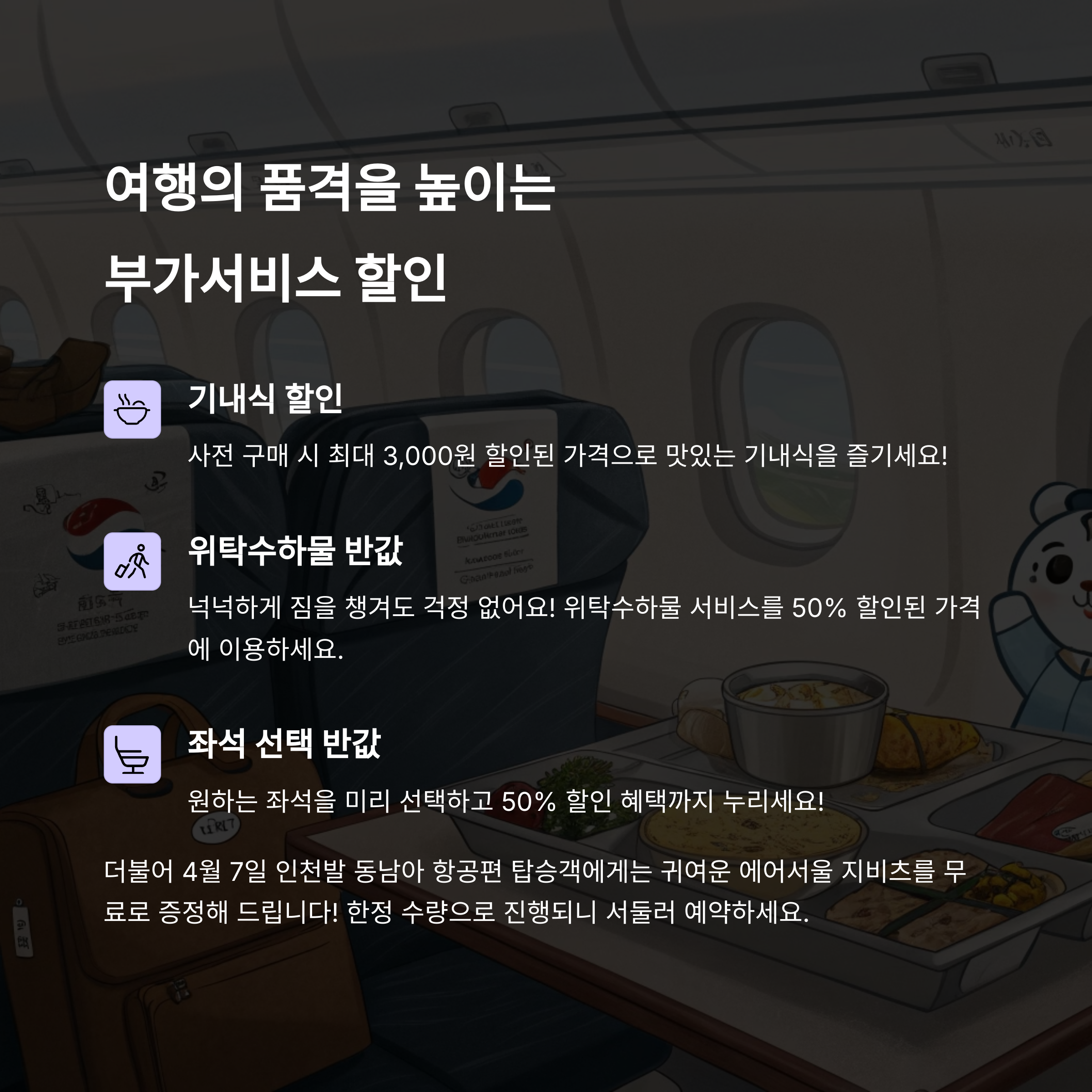 - 위탁수하물과 사전 좌석 예약 시 50% 할인