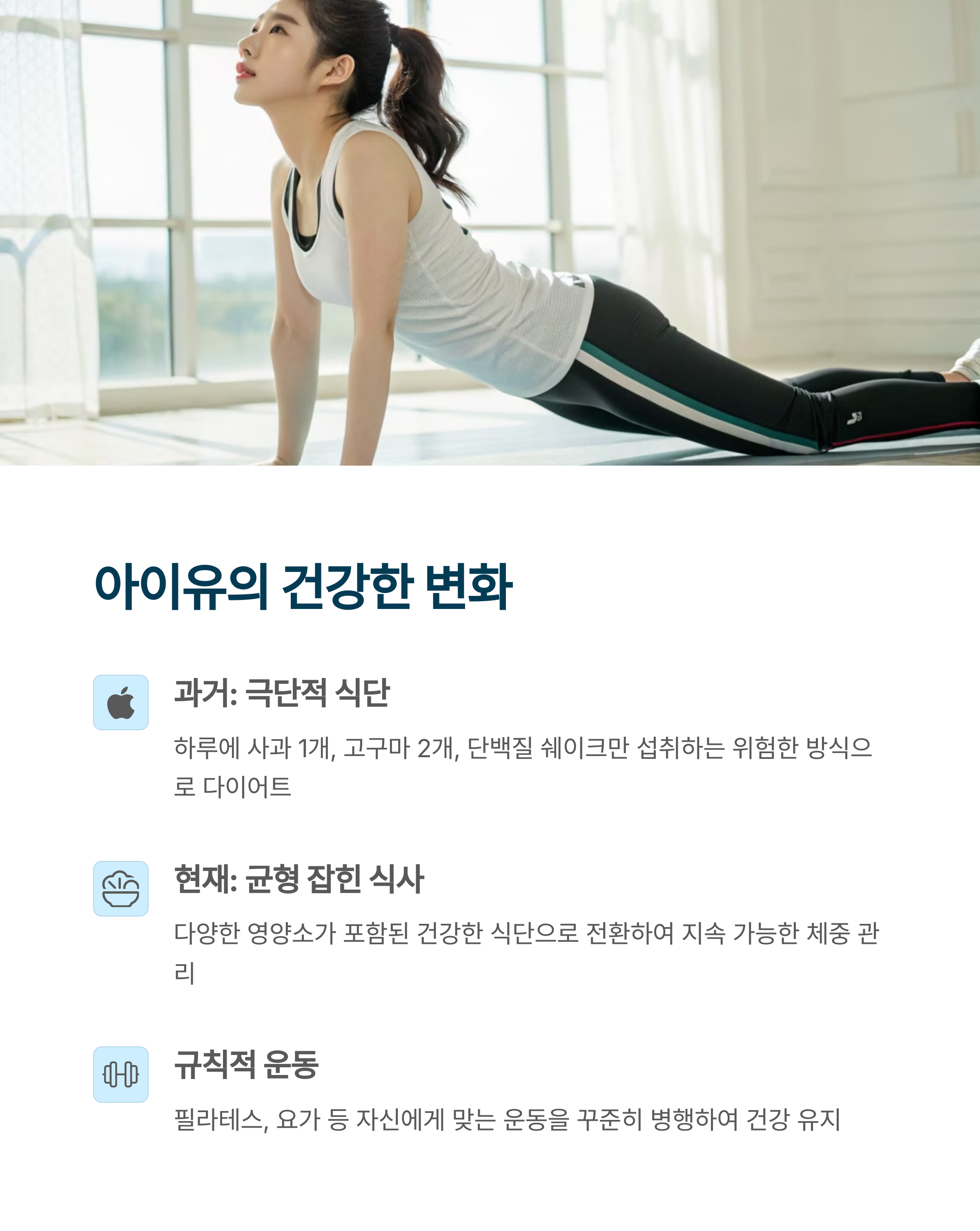 연예인들은 극단적인 다이어트보다 건강한 방법으로 지방을 줄이는 것을 선호합니다. 가수 아이유는 과거 극단적인 식단을 따르기도 했지만, 현재는 균형 잡힌 식사를 하며 꾸준한 운동을 병행합니다. 배우 한고은은 '니트 다이어트'를 실천하며, 일상 속에서 자연스럽게 칼로리를 소모하는 습관을 기르고 있습니다.