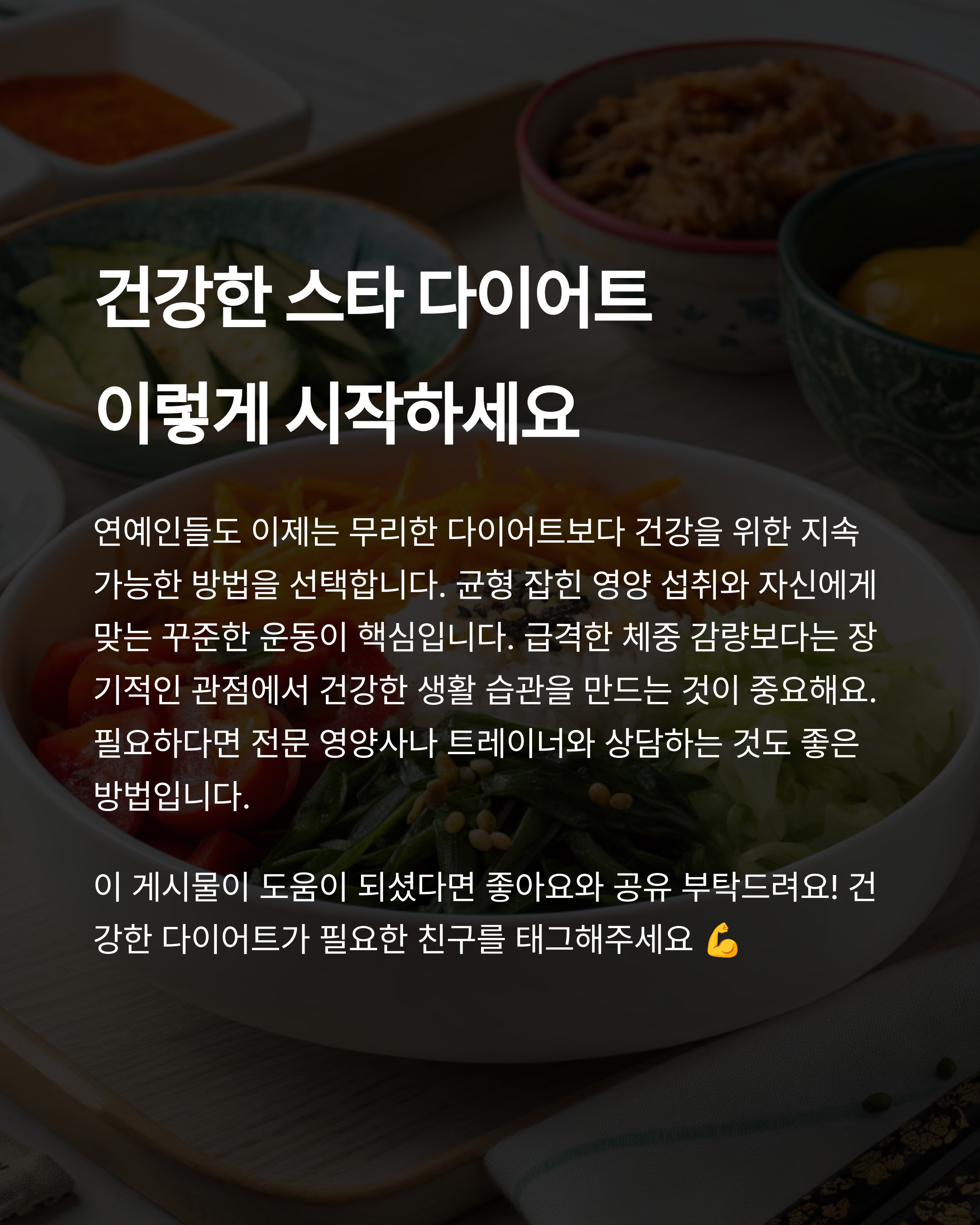 건강한 몸을 유지하기 위해서는 올바른 식습관과 꾸준한 운동이 필수적입니다. 연예인들이 실천하는 다이어트 습관을 참고하여 무리하지 않고 지속 가능한 방법을 선택해 보세요.