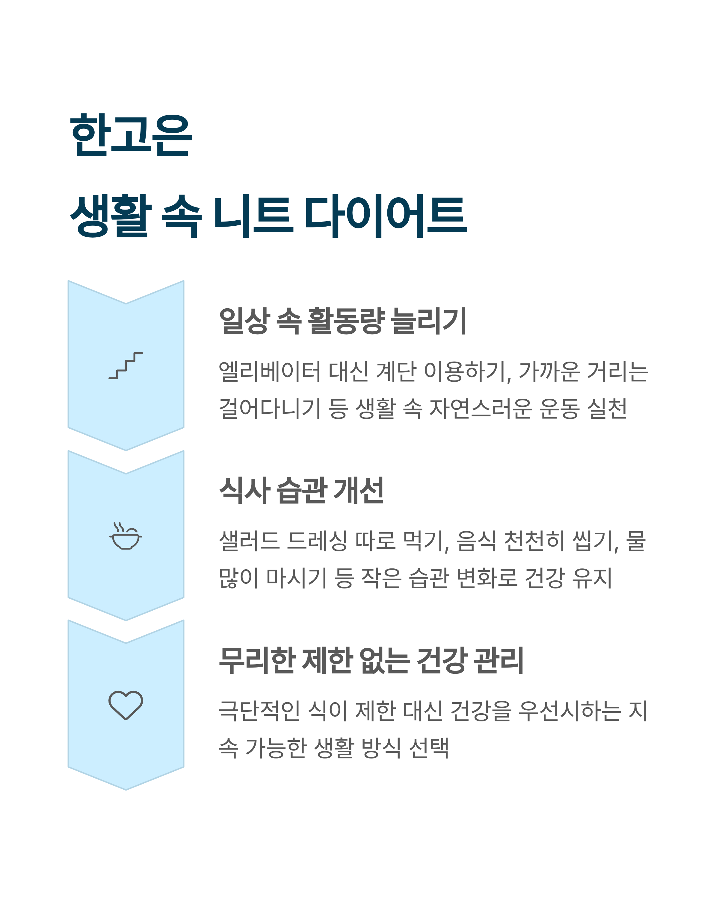 식사 시 불필요한 드레싱 줄이기 자주 걷고 활동량 늘리기 꾸준한 운동 루틴 유지하기