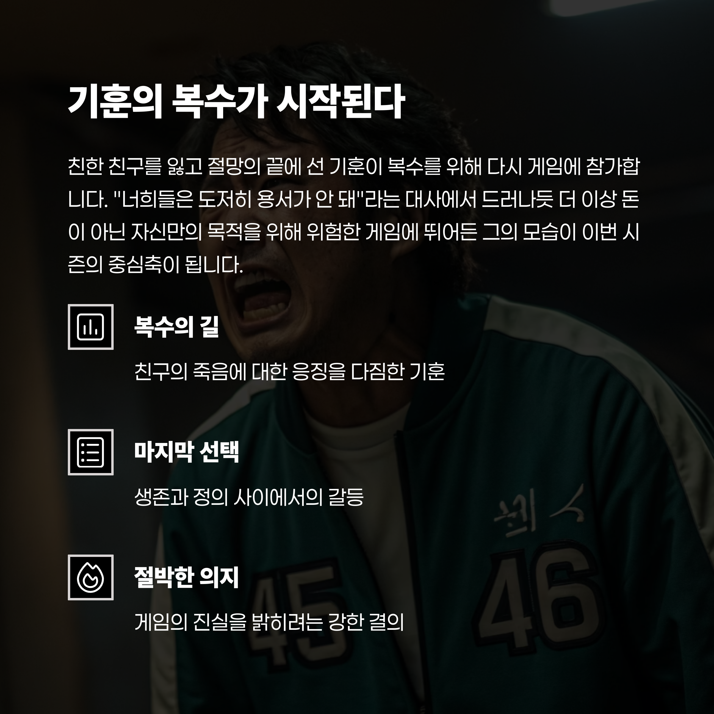 이번 시즌의 줄거리는 “기훈의 복수”와 “프론트맨의 진실”이라는 두 축을 중심으로 진행됩니다. 기훈(이정재)은 붉은 머리로 다시 등장하며, 과거 게임 참가자에서 조직 내부로 침투하는 인물로 탈바꿈하죠. 프론트맨(이병헌)은 과거의 상처와 조직 내 권력 구조를 드러내며 새로운 갈등을 만들어냅니다. 이 외에도 준호의 생존, 노을의 반란, 신입 참가자들의 극단적인 생존 경쟁이 ‘마지막 게임’으로 점화됩니다. 기존의 인간성 고발을 넘어서, 이번 시즌은 제도와 권력에 대한 복수극이라는 평도 나옵니다.