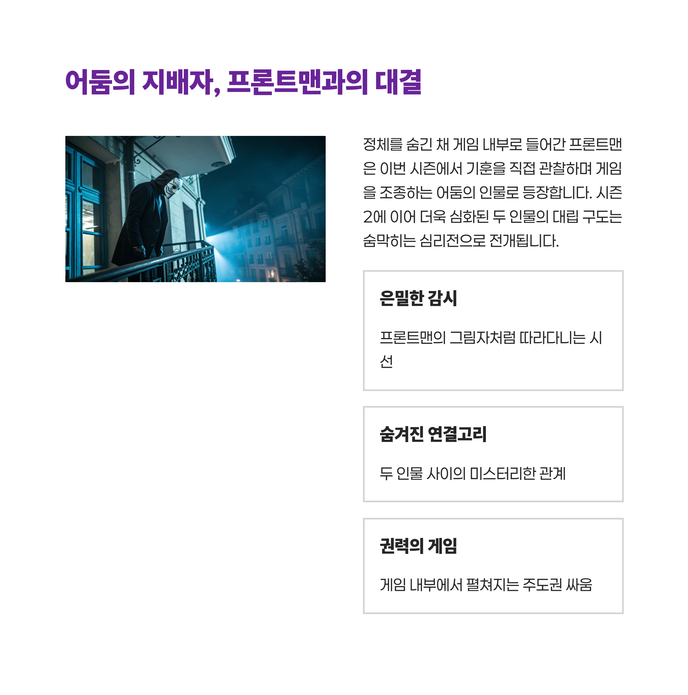 네, 기훈과 프론트맨, 노을 등의 주요 인물들이 시즌3에서 핵심 줄거리를 이끌며 새로운 국면을 맞이합니다.