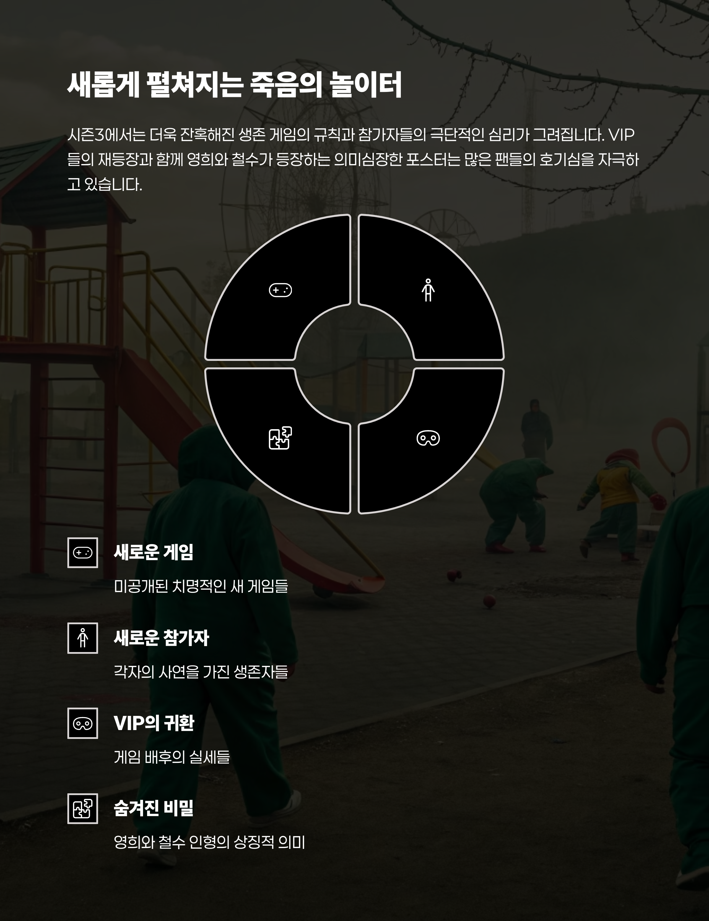 기존 시즌에서 풀리지 않았던 떡밥 회수는 물론, 새로운 캐릭터 등장과 예측 불가한 전개가 팬들의 상상을 자극하죠. 기훈 vs 프론트맨의 대립 구도, VIP 세력의 이면, 생존자들의 후일담 등 다양한 서사가 교차되며 클라이맥스를 향해 달려갑니다. 특히 “마지막 생존자는 누구일까”라는 질문이 시리즈 내내 중심축을 이룹니다. 이전 시즌보다 감정선과 긴장감이 훨씬 농도 짙어질 것이라는 제작진의 예고도 기대감을 더하고 있습니다.