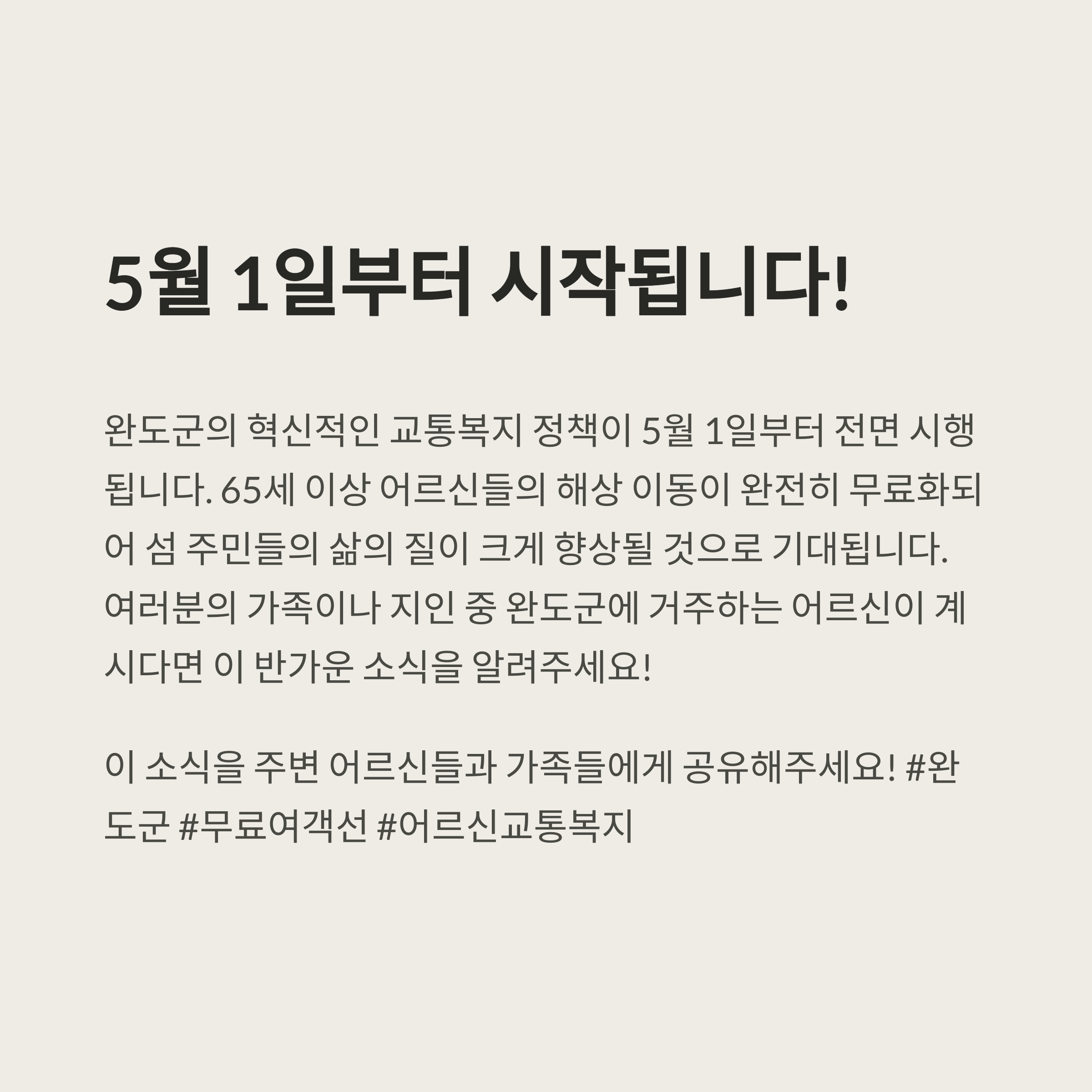 완도군의 사례가 성공적으로 자리 잡으면, 다른 섬 지역이나 고령화가 심각한 지역에서도 비슷한 제도를 도입할 가능성이 충분히 있습니다. 물론 예산이나 행정 여건에 따라 조정이 필요하겠지만, '교통 복지가 단순한 서비스가 아니라 생존권 보장'이라는 인식이 확산된다면 변화는 더 빨라질 거예요. 완도군이 좋은 선례를 만든 만큼, 앞으로 비슷한 따뜻한 정책들이 더 많이 나왔으면 좋겠어요.