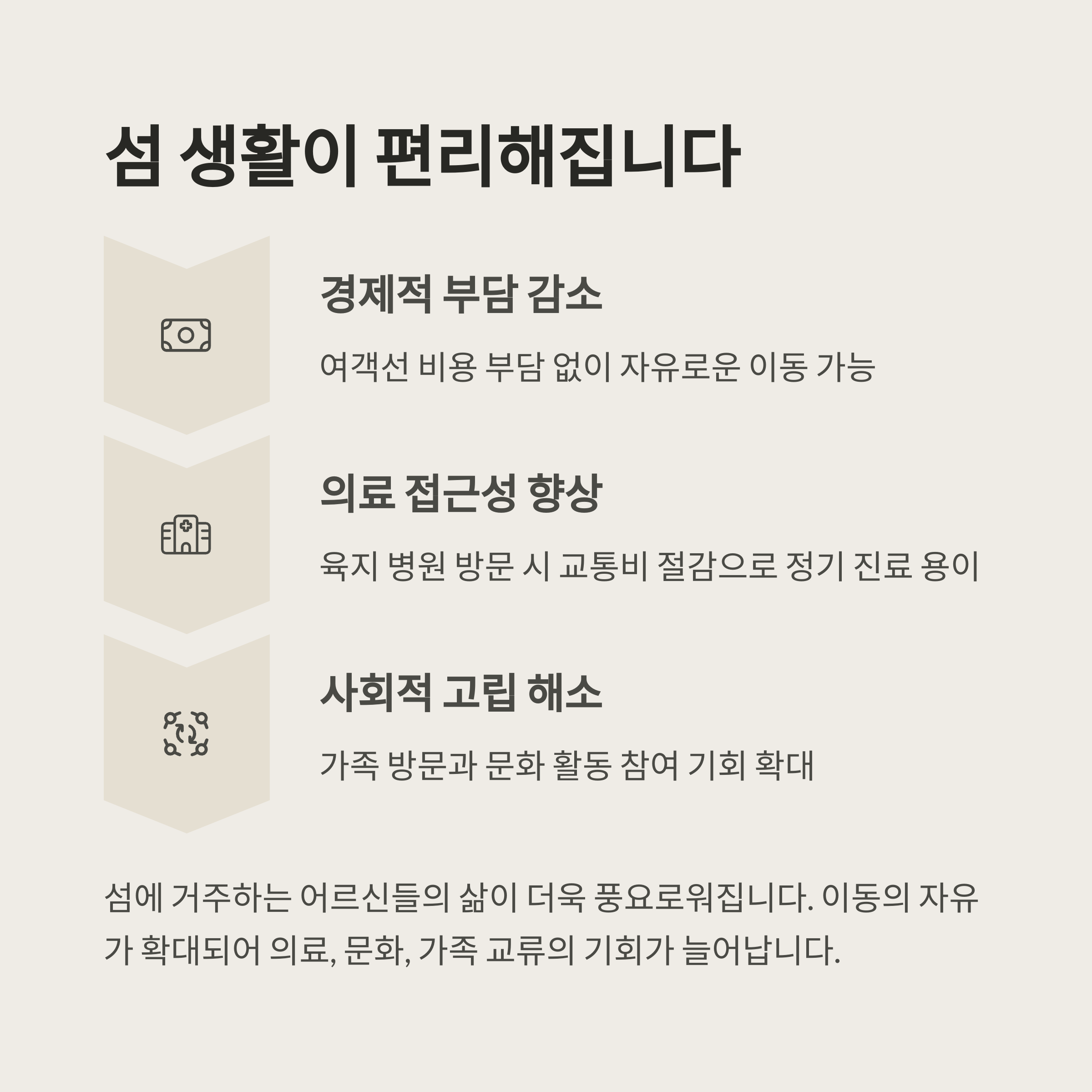 어르신들은 "이젠 마음 편히 육지 나갈 수 있어서 너무 좋다", "자식들 부담도 덜게 됐다"며 반기고 있어요. 특히 가족 방문, 병원 진료, 장보기 등 꼭 필요한 이동이 가능해진다는 점에서 삶의 질이 확 달라질 거라는 기대가 커요. 실제로 주민센터나 군청에도 감사 인사가 많이 들어오고 있다고 하네요. 이런 정책, 사람들 마음을 따뜻하게 해주는 힘이 있어요.