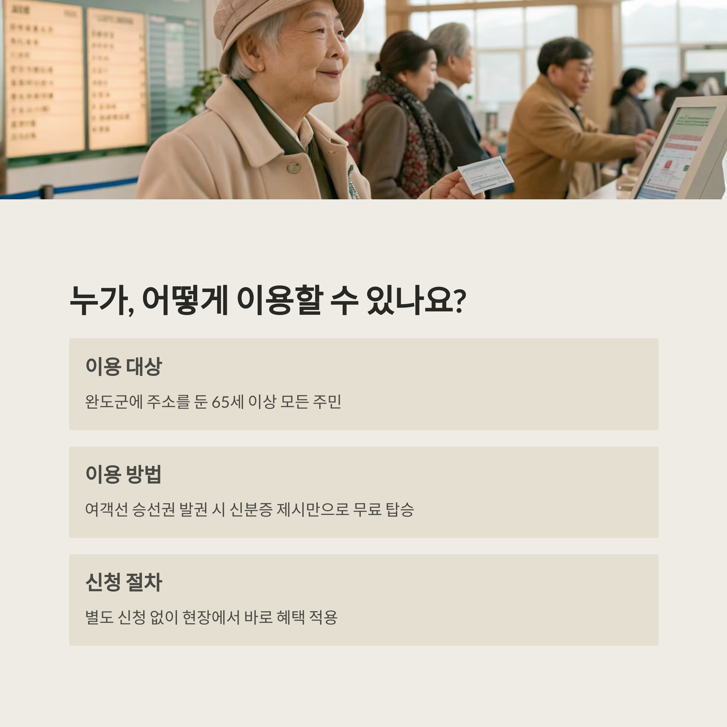 완도군은 65세 이상 주민을 대상으로 여객선 운임 전액을 지원하는 제도를 전국 최초로 시행합니다. 방법은 아주 간단해요. 여객선 승선권을 발권할 때 신분증만 제시하면, 완도군 내 모든 해상 여객선 구간을 무료로 이용할 수 있어요. 평소 육지로 나가거나 다른 섬으로 이동할 때 드는 교통비 걱정을 크게 덜 수 있겠죠? 이동의 자유가 더 넓어지는 거예요!