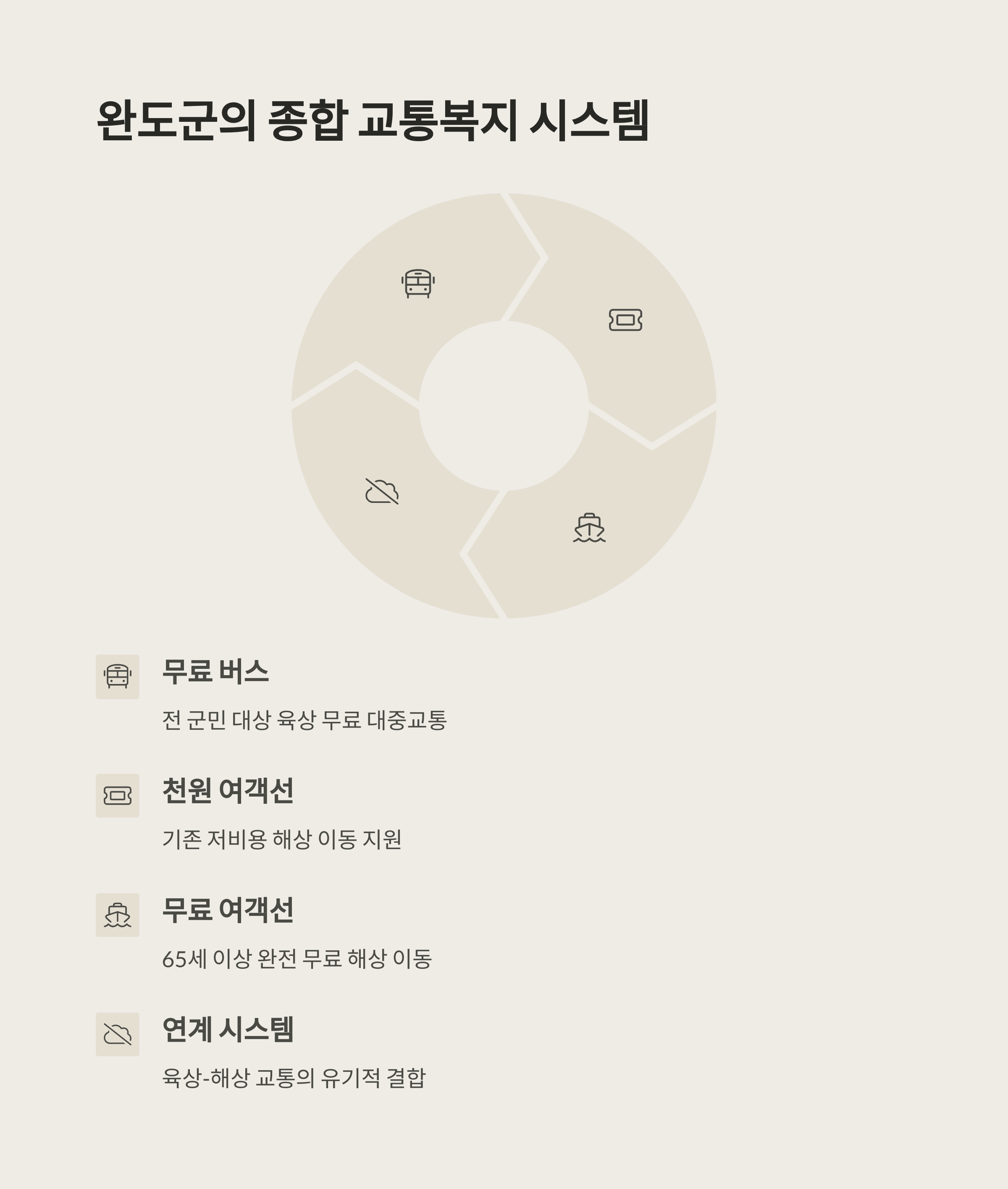 사실 완도군은 예전부터 교통복지에 진심이었어요. 전 군민 무료버스 운행, 도서민 여객선 1,000원 지원, 야간 여객선 확대 같은 파격적인 제도들을 이미 시행해왔습니다. 이번 여객선 완전 무료 정책은 그 흐름을 이어가는 결정판이라고 볼 수 있어요. 특히 섬 주민들에게는 '교통'이 생명줄과도 같은데, 이런 부분을 세심하게 챙기는 모습이 진짜 감동입니다. 다른 지역도 본받아야 하지 않을까요?