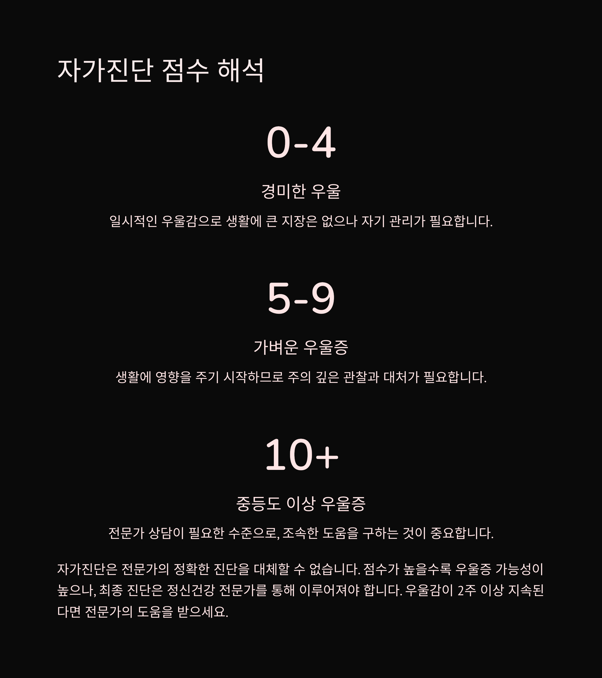 총점이 10점 이상일 경우 우울증이 의심되며, 정신건강 전문가와의 상담을 권장합니다. 자가진단은 참고용으로만 사용하며, 정확한 진단과 치료는 전문가의 도움을 받아야 합니다.