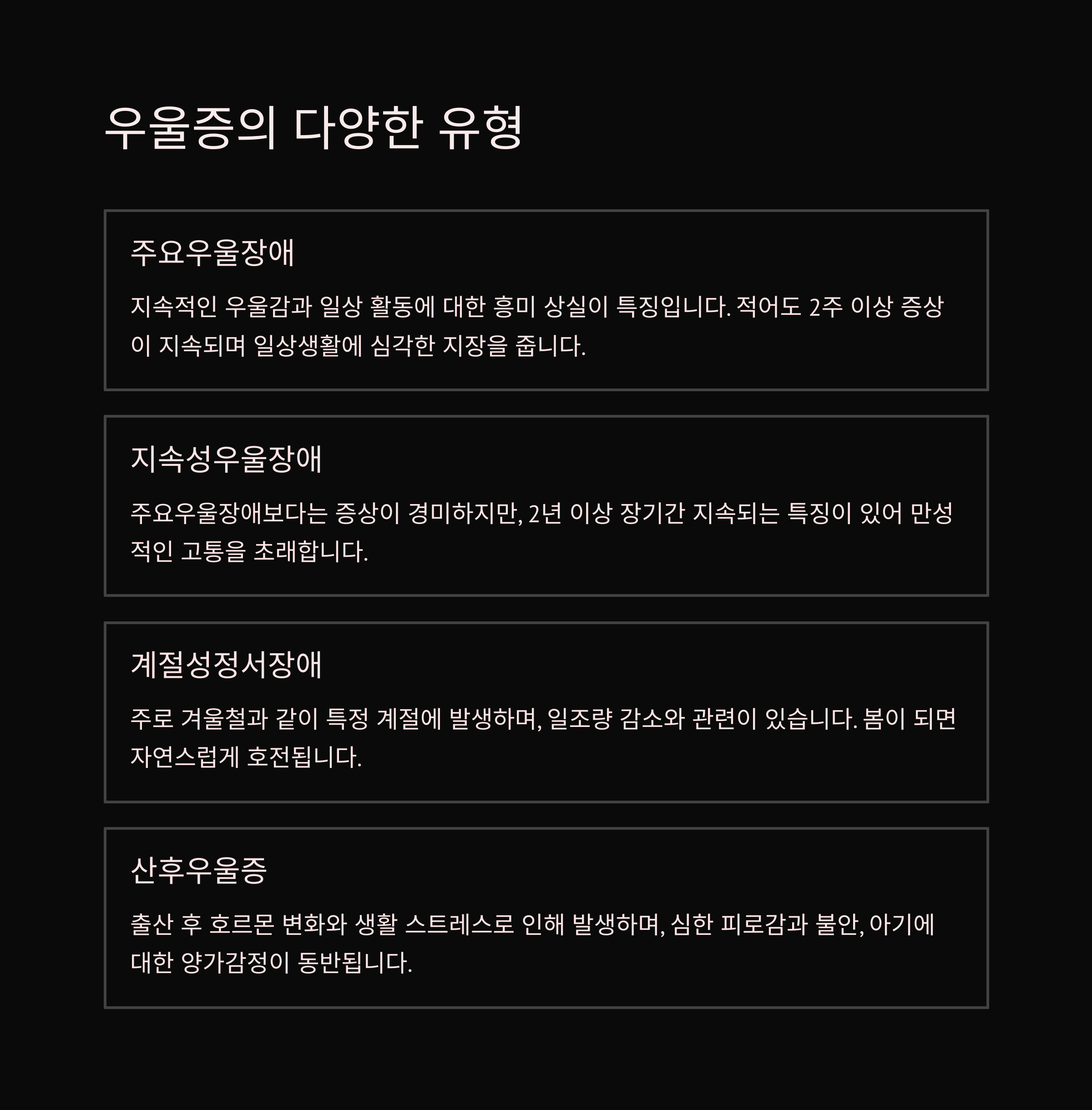 혹시 요즘 우울감이 자주 느껴지나요? 우울증은 다양한 형태로 나타나며, 각 유형마다 특징이 다릅니다.