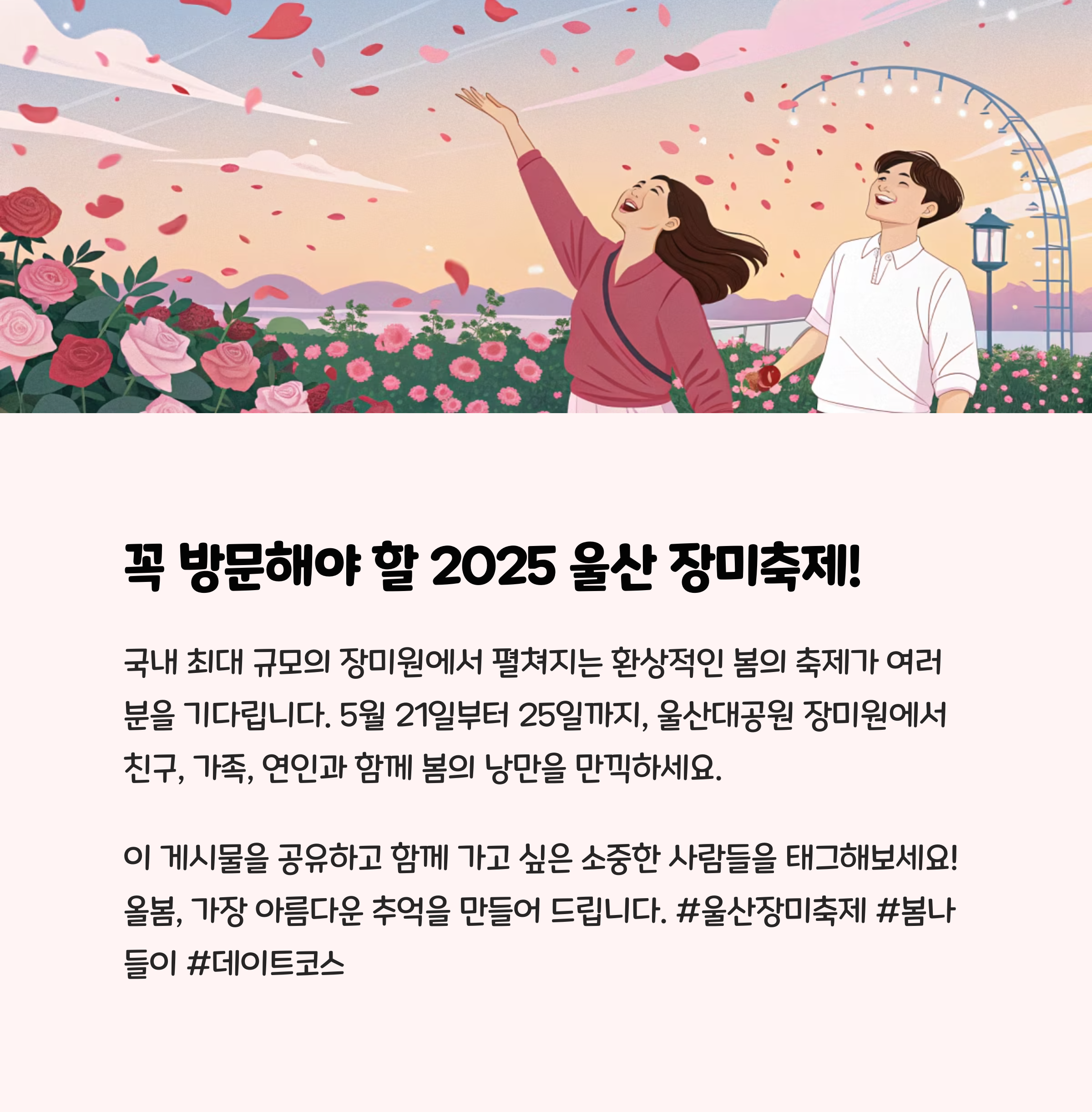 올해는 특별한 추억을 만들고 싶다면 울산 장미축제를 리스트에 꼭 넣어보세요!혹시 다녀오셨다면 포토존에서 찍은 감성샷도 공유해주세요. 이 예쁜 순간은 우리만 알고 있긴 아까우니까요.