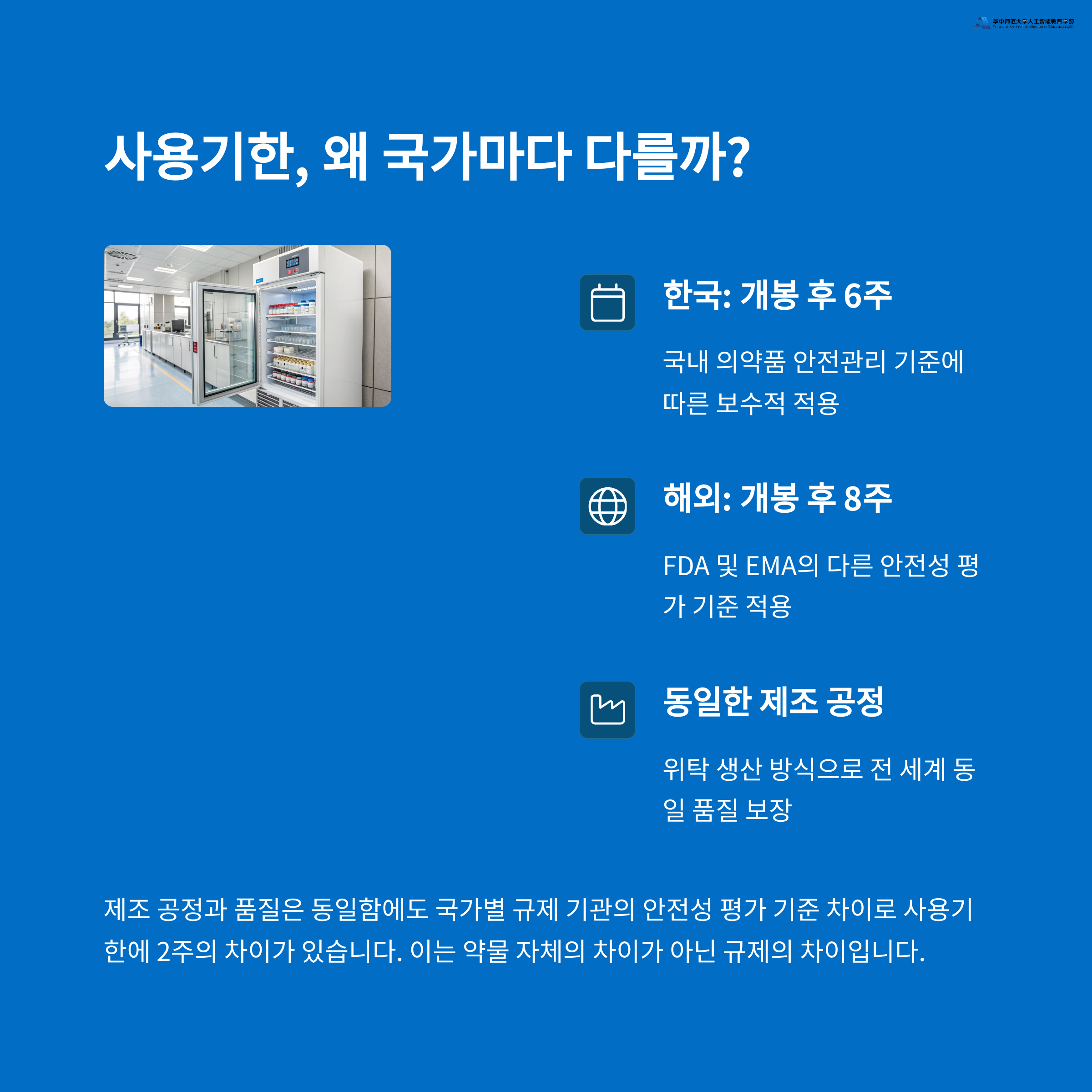 같은 약인데 사용 기간이 왜 다르냐고요? 제조 공정은 동일하지만, 각국의 규제나 사용 권장 기준이 달라서 그래요.
