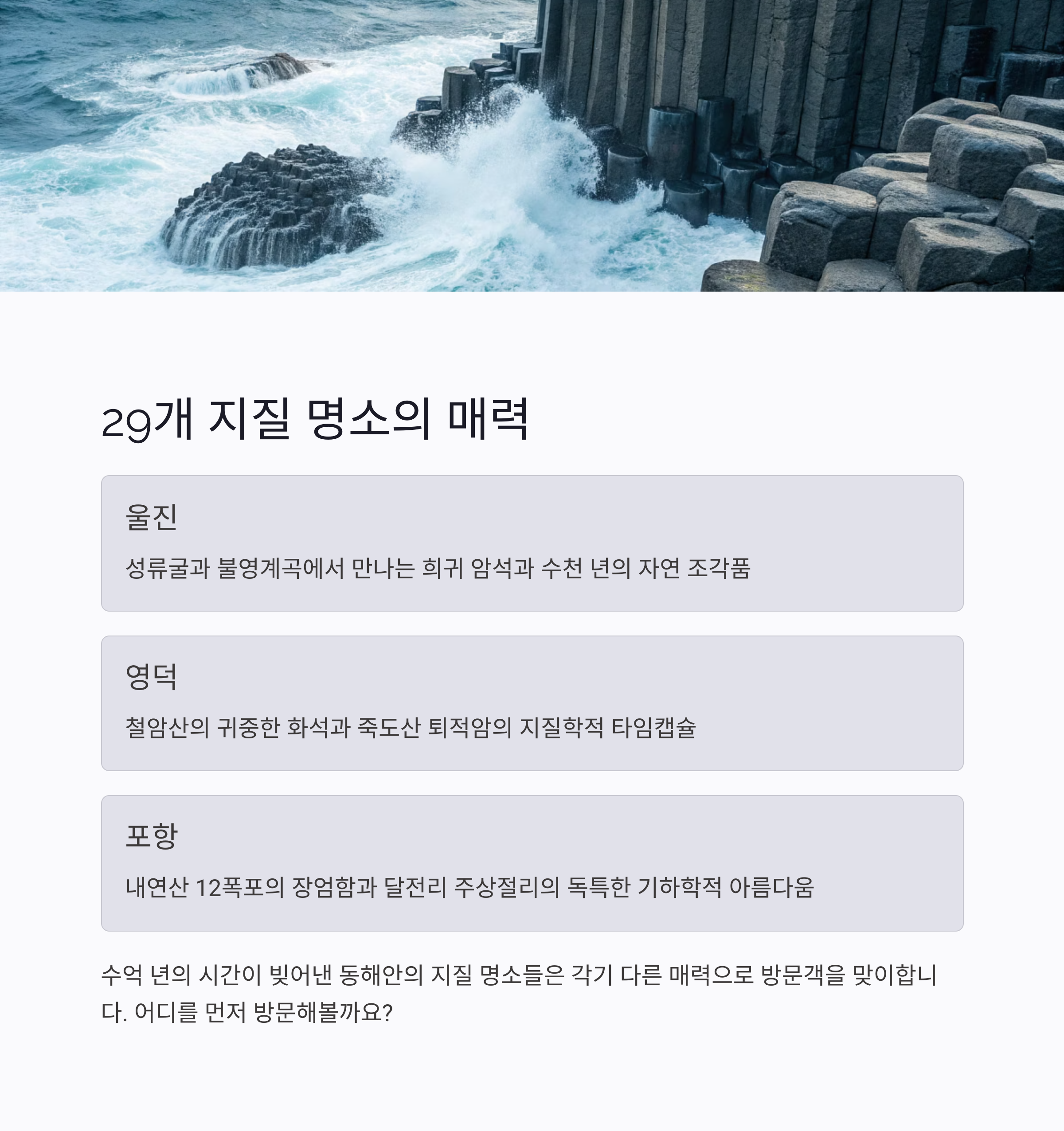경북 동해안 지질공원은 단순한 풍경 명소를 넘어서, 지질학적으로 세계적으로도 희귀한 지역입니다. 이곳은 단층과 해안단구, 주상절리, 화석 지대 등 다양한 지구의 역사를 직접 마주할 수 있는 체험형 공간으로서 지금 세계 여행자들이 주목하고 있는 자연유산 중 하나입니다.